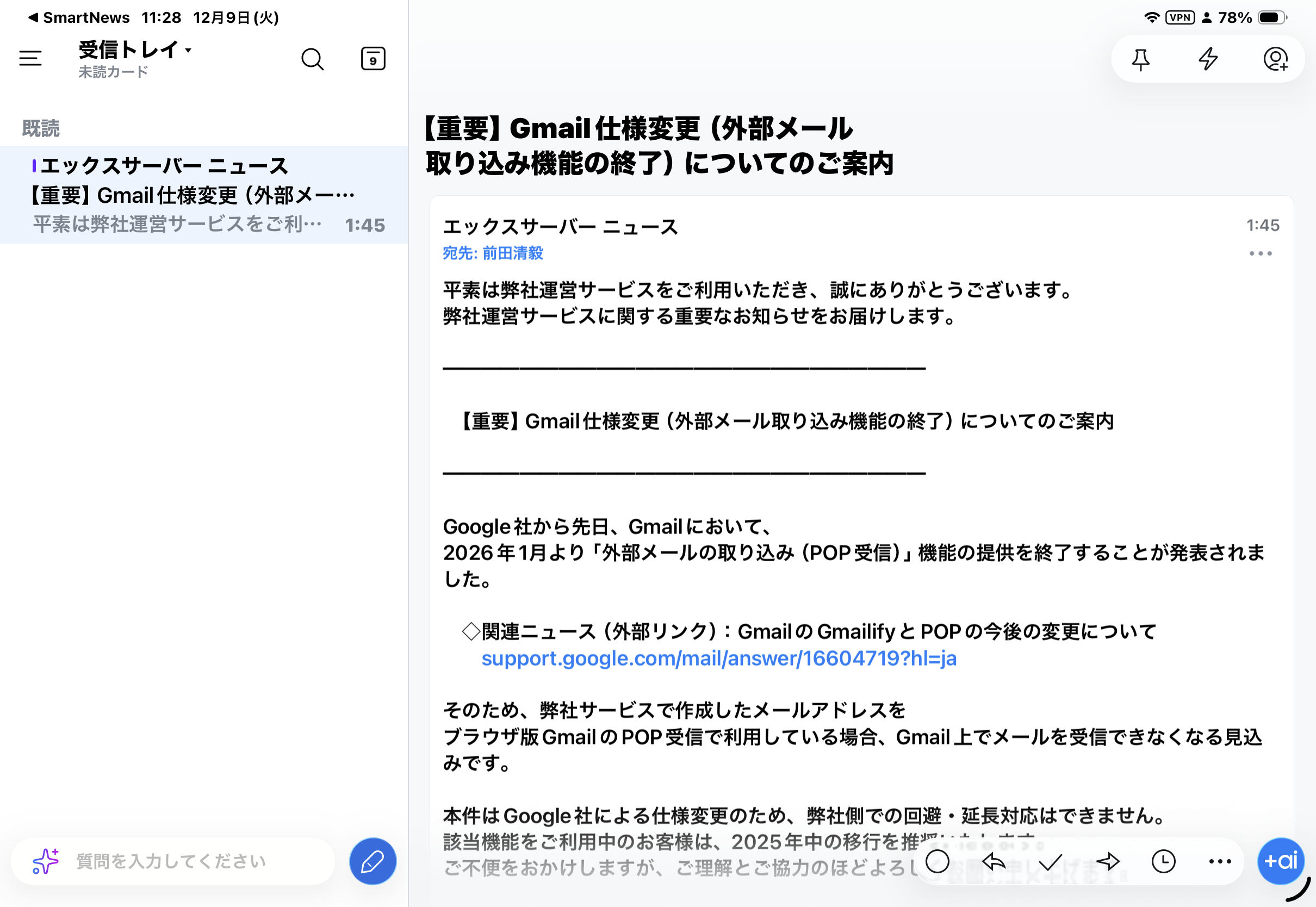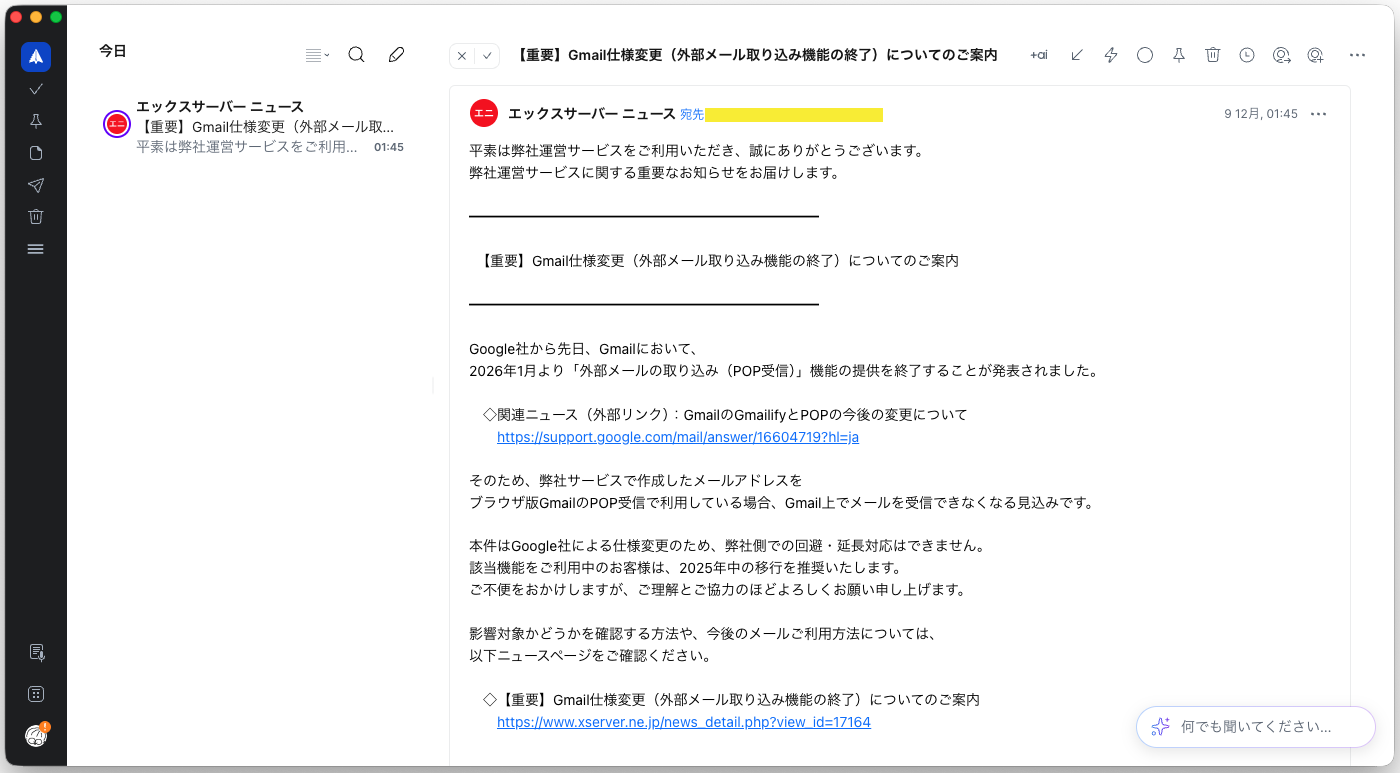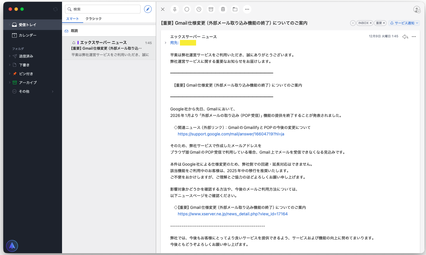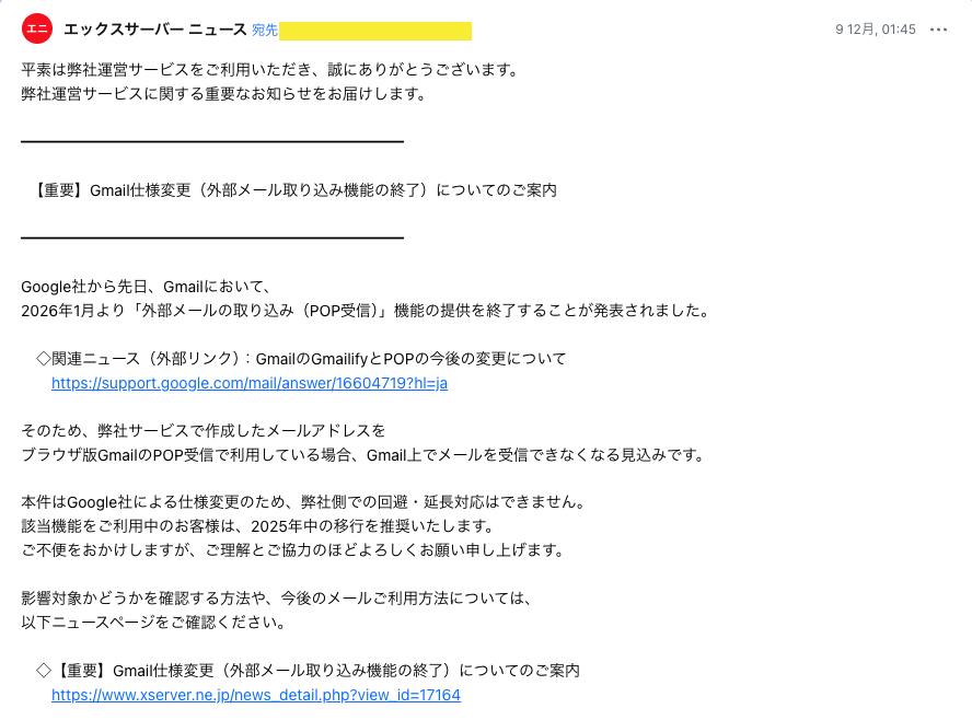 このブログを運営しているサーバーの運営会社であるXSERVER社から、2026年1月からGmailで利用できていた外部メール取り込み機能が使えなくなるとのニュースが送られてきました。