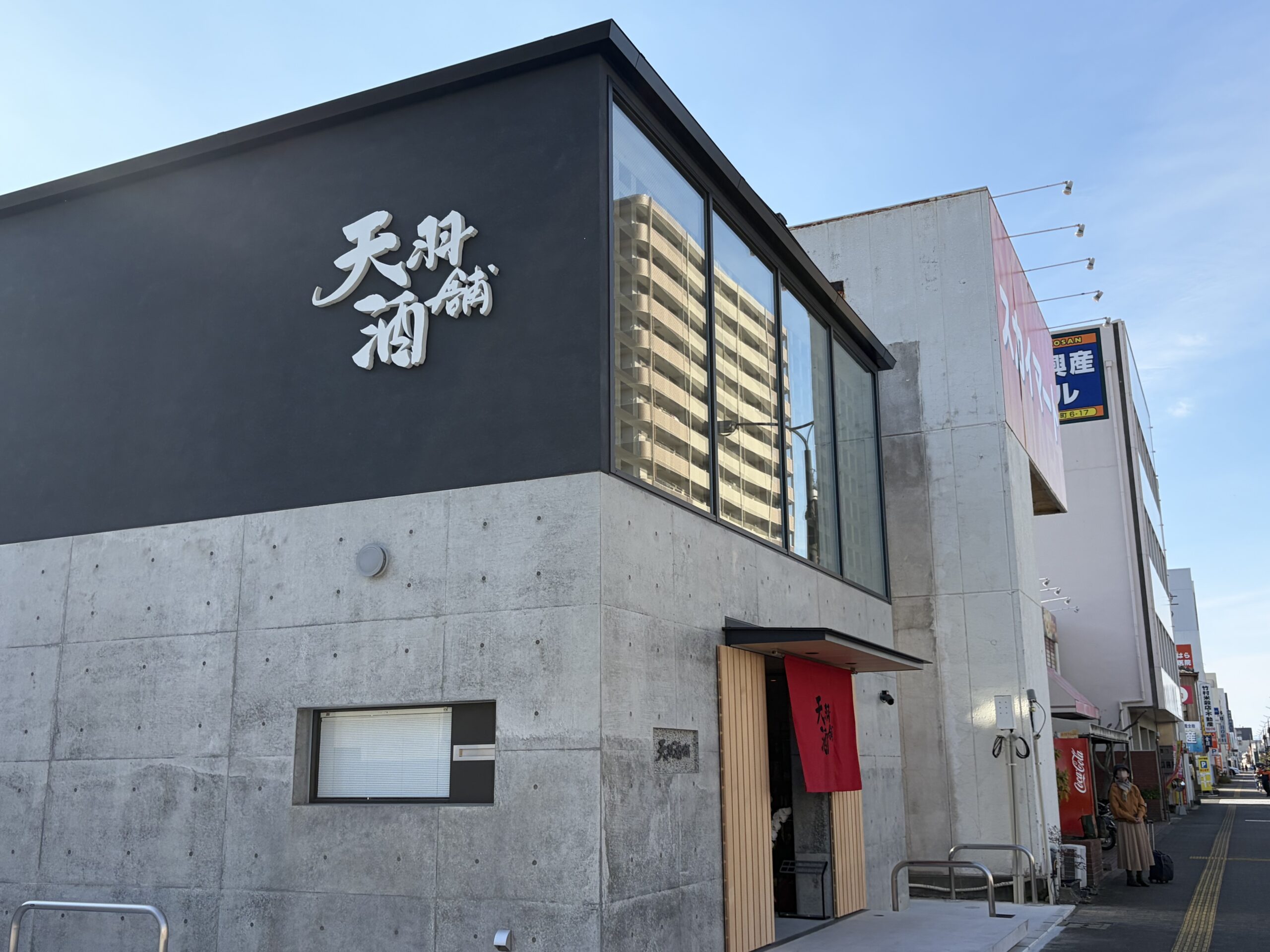 日本酒を仕入れていた天羽酒舗が建て替えを終えて新装開店していましたので、久しぶりに行ってみることにしました。旧店舗は木造でしたが、新店舗はコンクリート造りのモダンな建物に変わっていました。