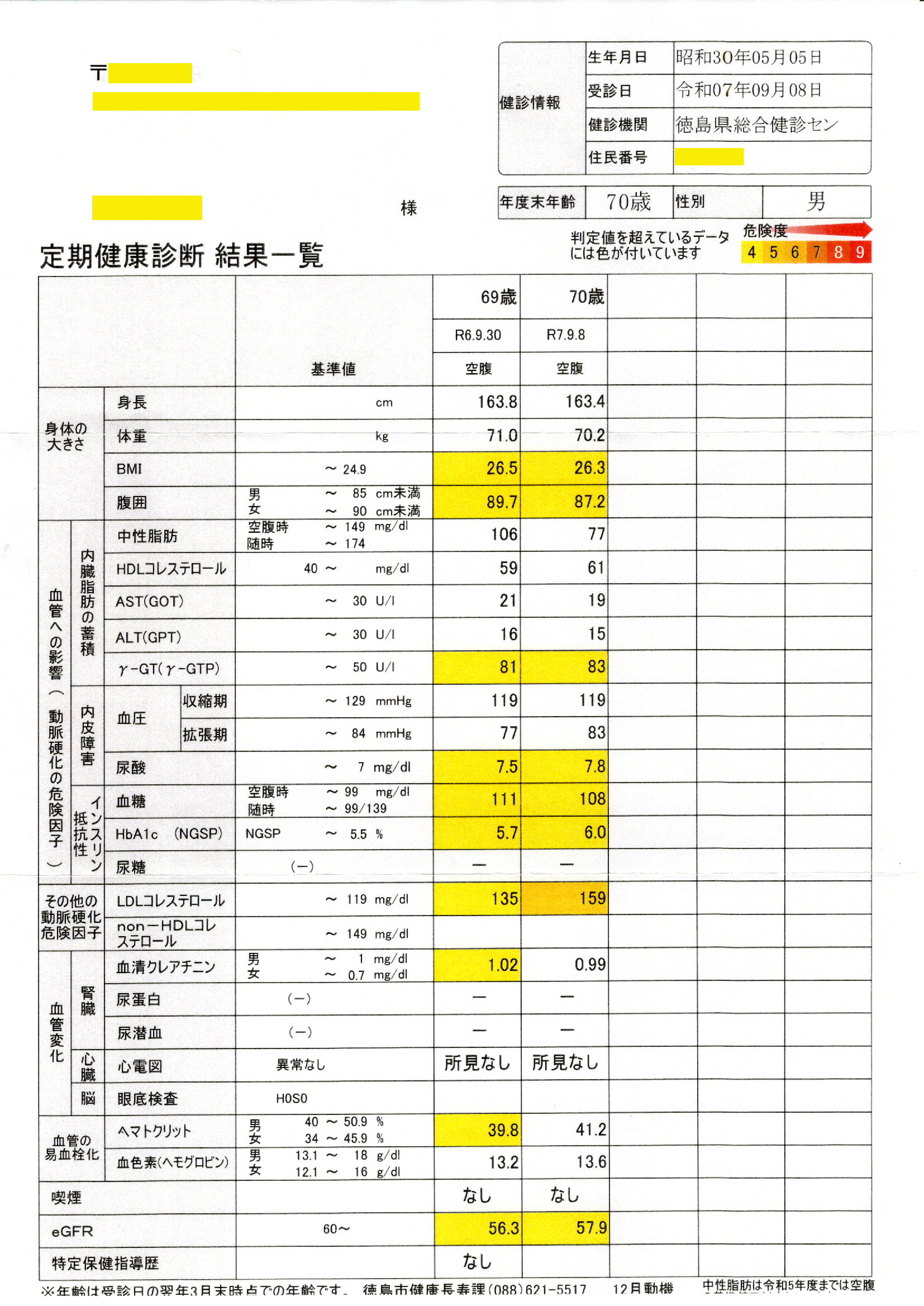 保健指導ではLDLコレステロールの値が高くなりかけているようなので、念のために「頸動脈エコー検査」を受けてみることになりました。後日、検査票が送られてきて特定健診を受けた総合検診センターに連絡して検査日を決めてエコー検査を受けることになるそうです。検査結果は徳島市に還元されて今回と同じような面談での結果報告になるそうです。