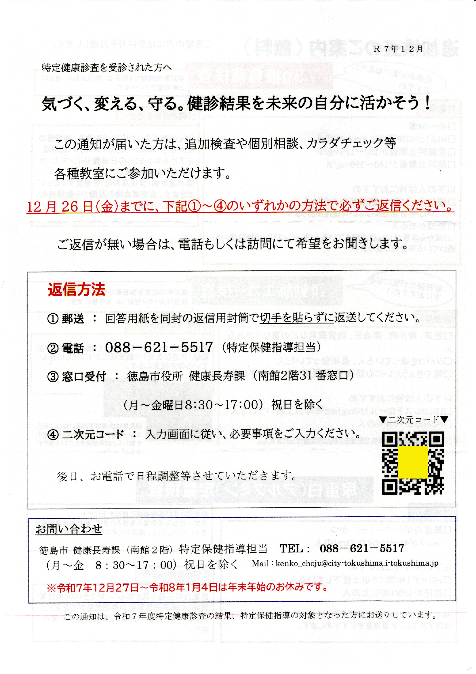 12月15日に徳島市健康福祉部健康長寿課から封書が届き、開封してみると特定保健指導を受けろというものでした。