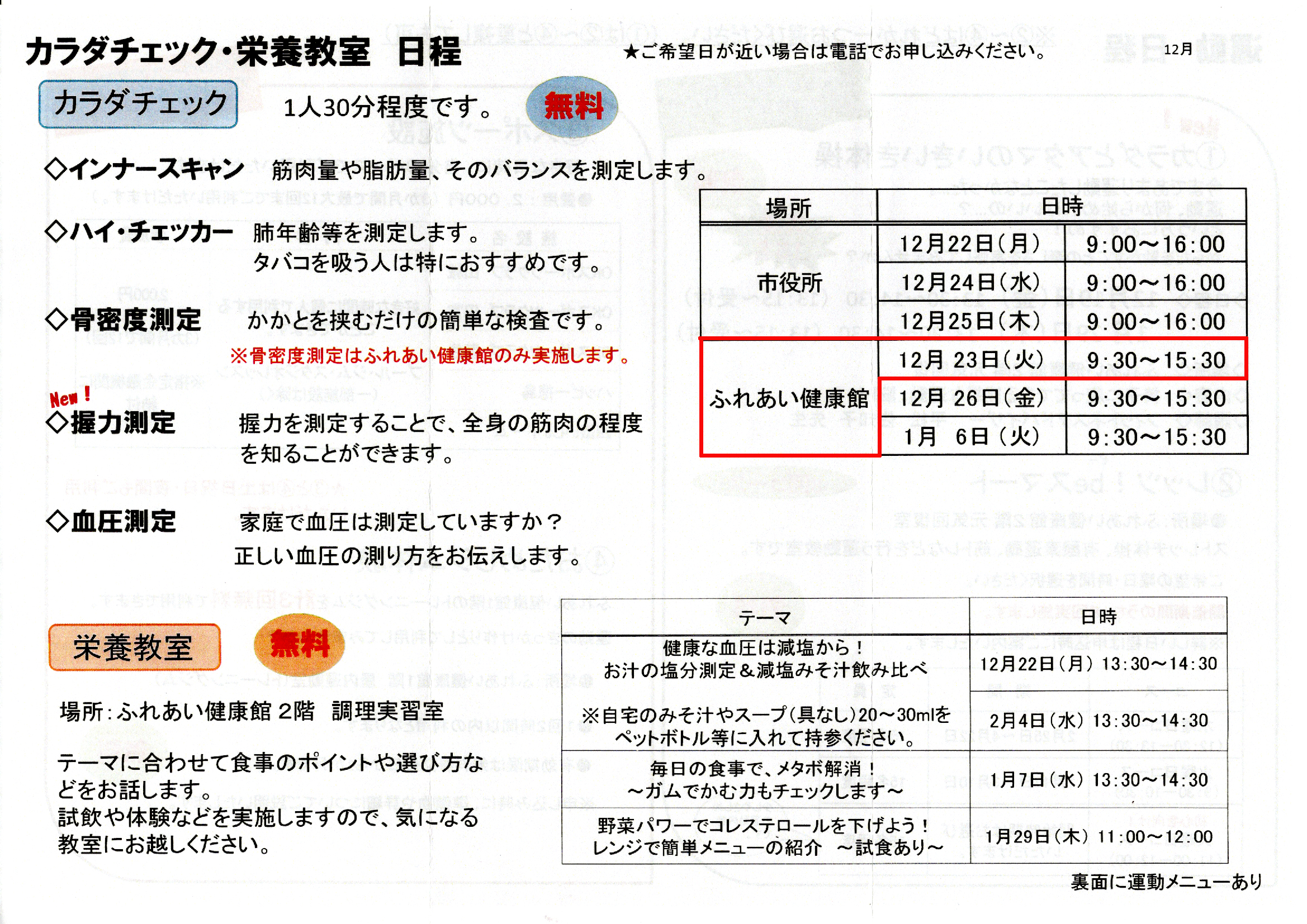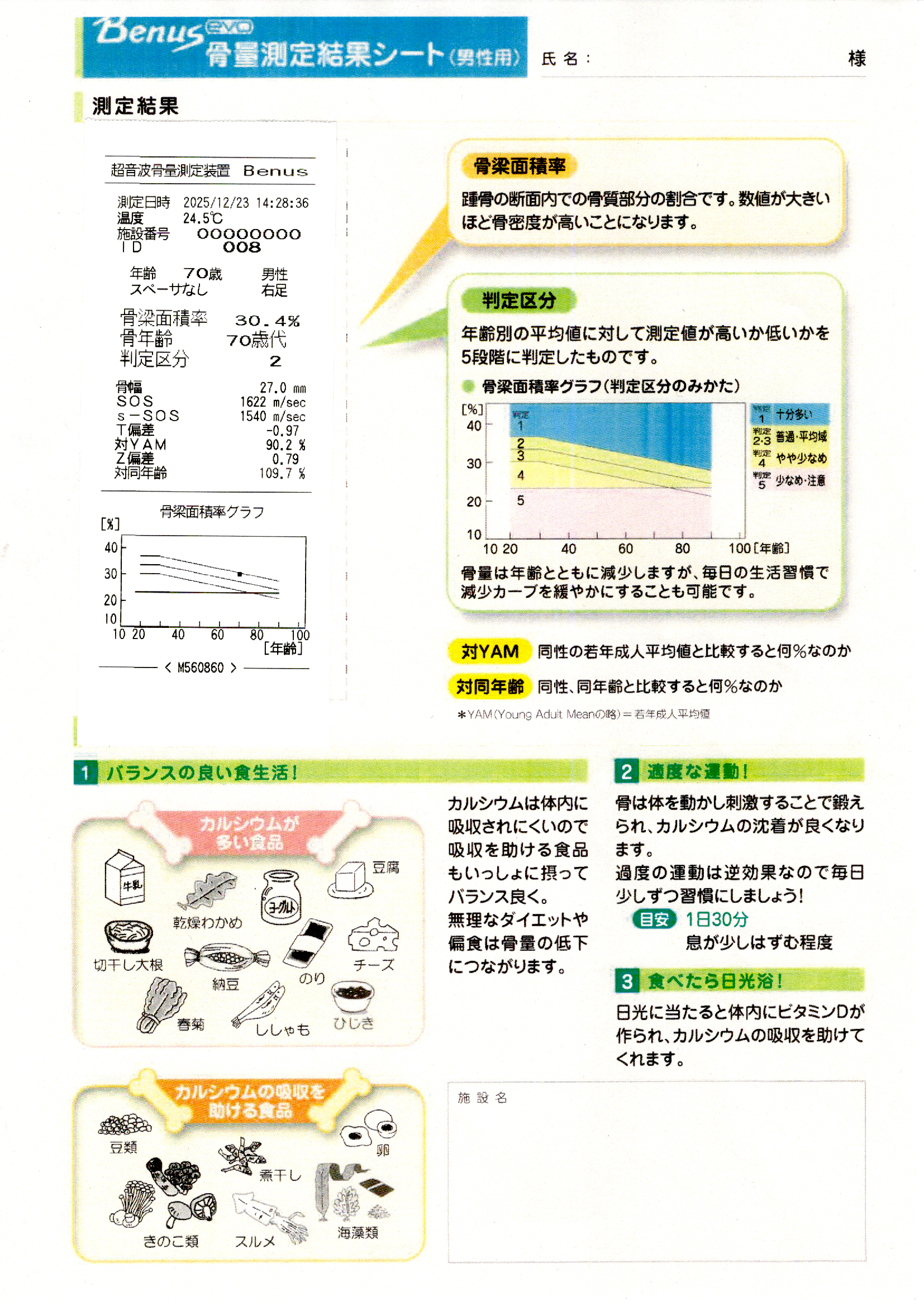 予約していた時間に「ふれあい健康館」の2Fに向かうと一つの入口の前に「カラダチェック」と書かれた看板が立っていました。部屋の外には誰もいないのでノックをしてドアを開けると担当者と思われる女性がいらっしゃいました。名前と予約時間を告げると既に書類などが準備されていて、直ぐに測定に入りました。最初は骨密度測定で測定器に足を入れて踵の部分で骨密度を測るのだとか。踵の部分にエコー検査などで使われるようなジェルが塗られて、測定器に足を入れると踵の部分にパッドが当たって直ぐに測定が終了しました。次は体重と体脂肪率の測定でした。裸足で体重計の上に乗って数秒で終わりです。最後は血圧測定でした。