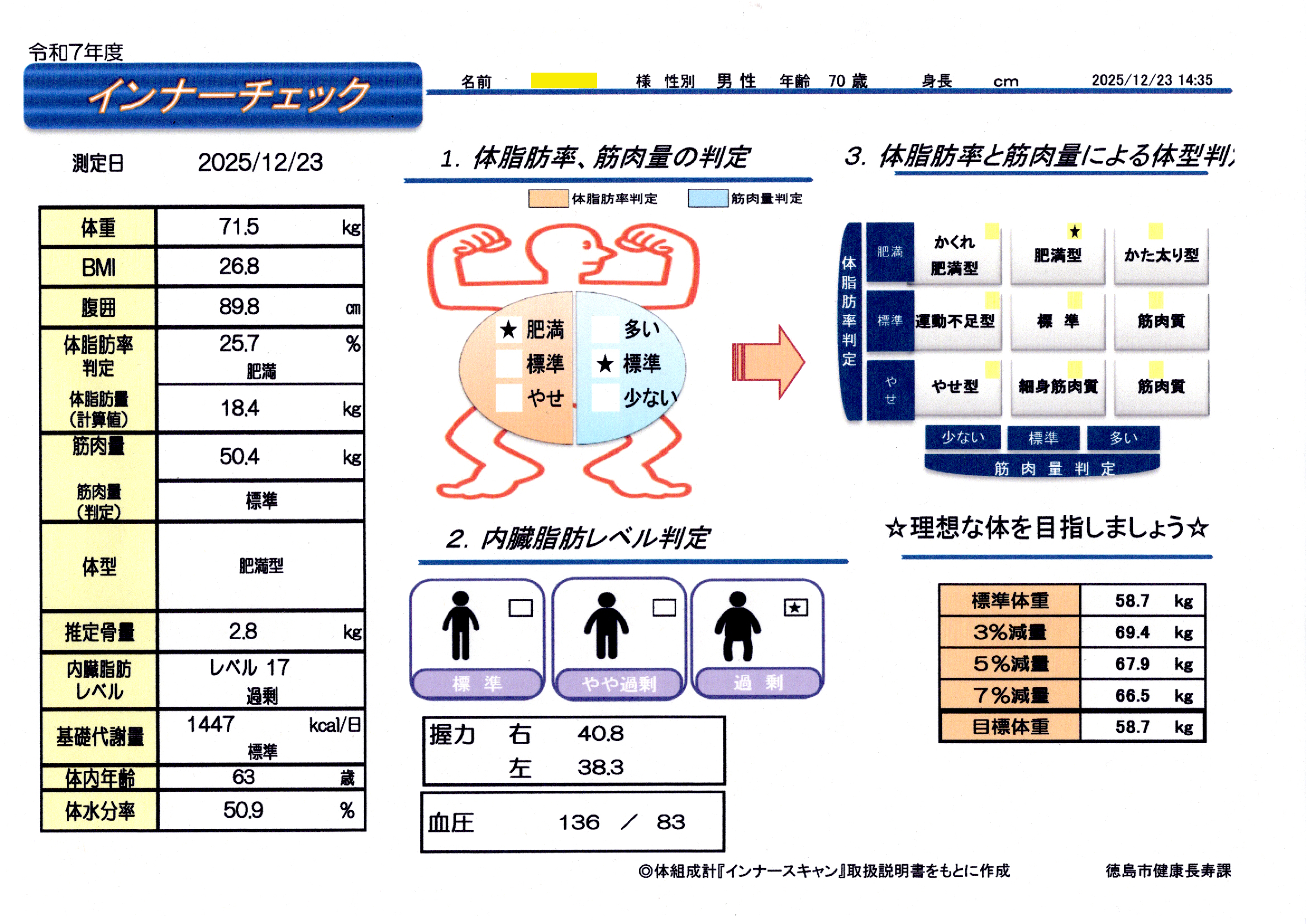 体脂肪の測定結果は高めに出ていて想定どおり「肥満」に分類されました。握力は弱いはずなのですが年齢相応だそう。血圧は高めの数値が出ました。