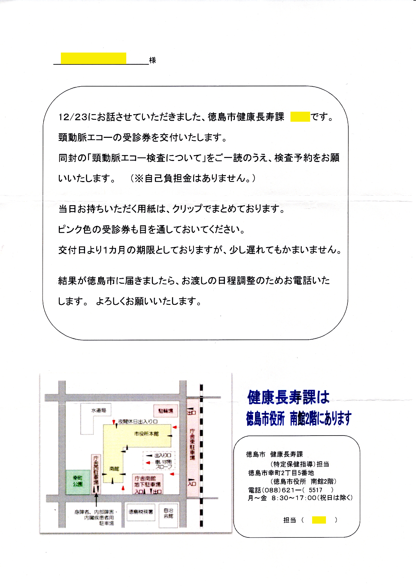 12月23日に受けた特定保健指導の中で受診することになった「頸動脈エコー検査」の受診券が送られてきました。