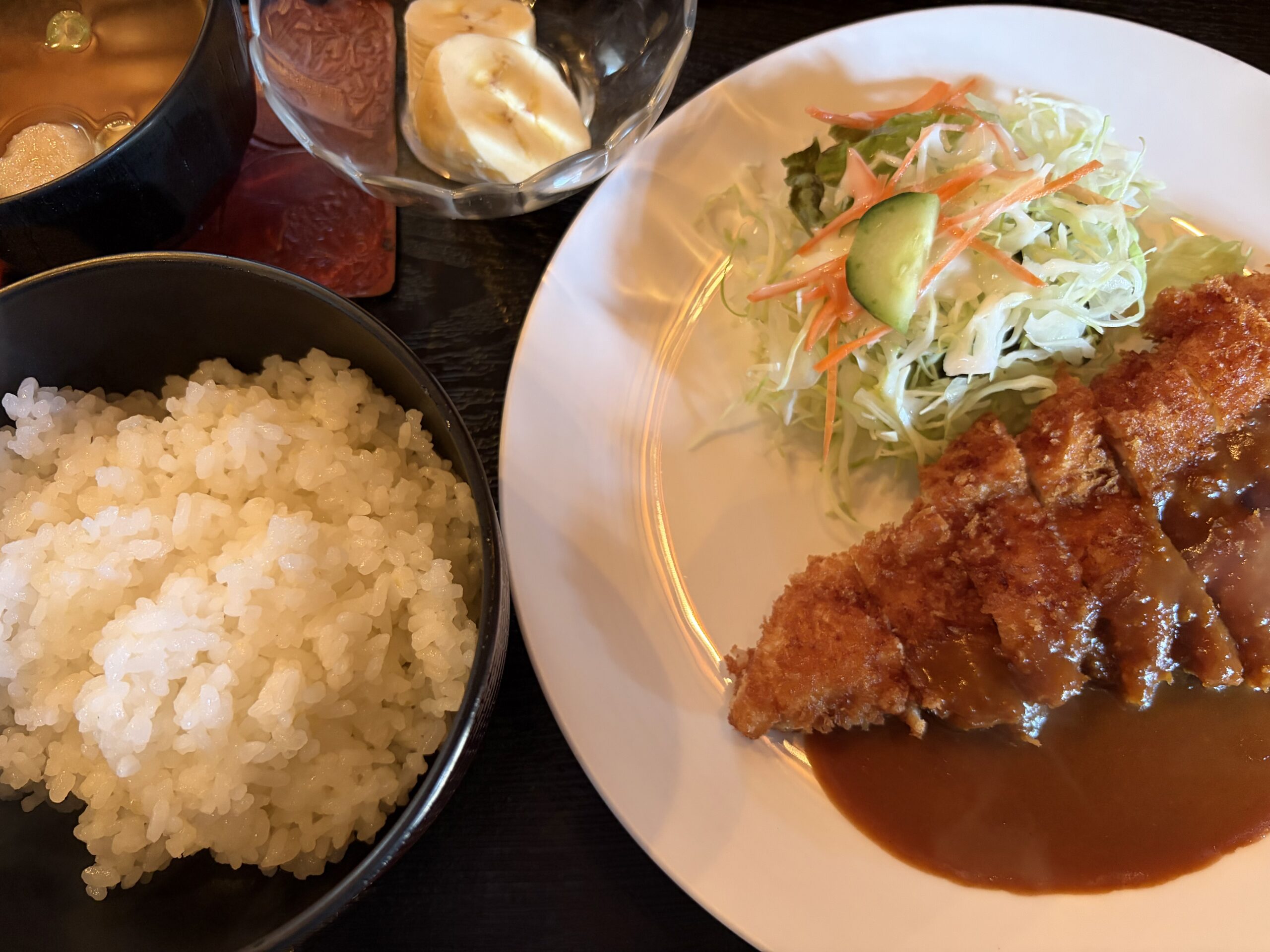 チキンカツはサクサクの衣に香ばしくてほんのりと甘味が感じられるデミグラスソースが掛かっていて、ソースをまぶしながら頂きます。ランチには丁度良い量です。