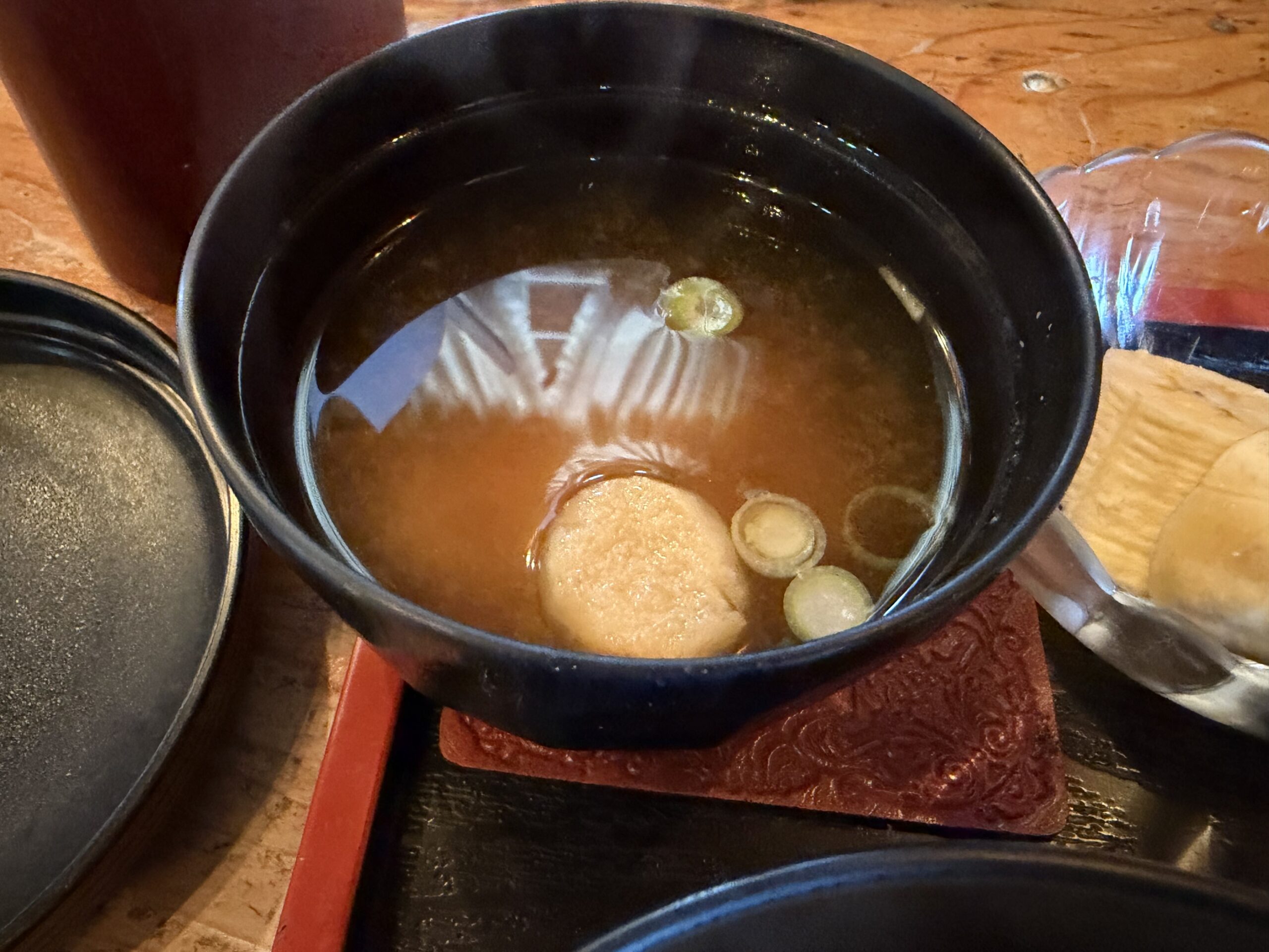 味噌汁はいつもの麩の味噌汁です。今日の味噌汁は温度が低めでした。これで800円なのでとてもリーズナブルだと思います。