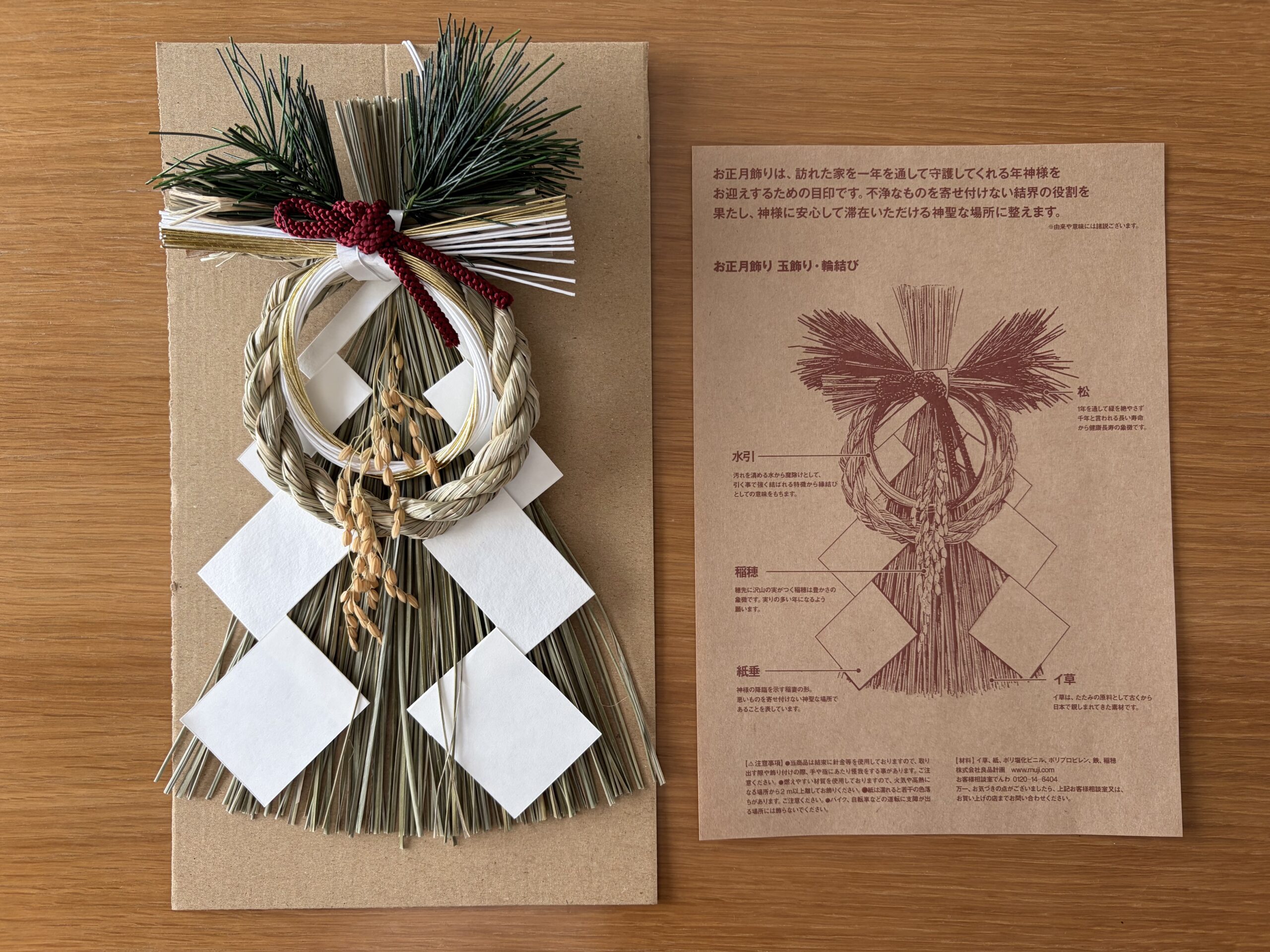 新年を迎えるために注連飾りを飾りました。徳島で一般的な注連飾りは「牛蒡締め」とか「大根締め」と呼ばれるもので、我が家も毎年同じような注連飾りを飾っていましたが、こうした注連飾りは横に長くて我が家では玄関ドアが当たらないようにしなければなりませんでした。できるだけシンプルなものをと今年は無印良品の注連飾り(玉飾り)を選びました。