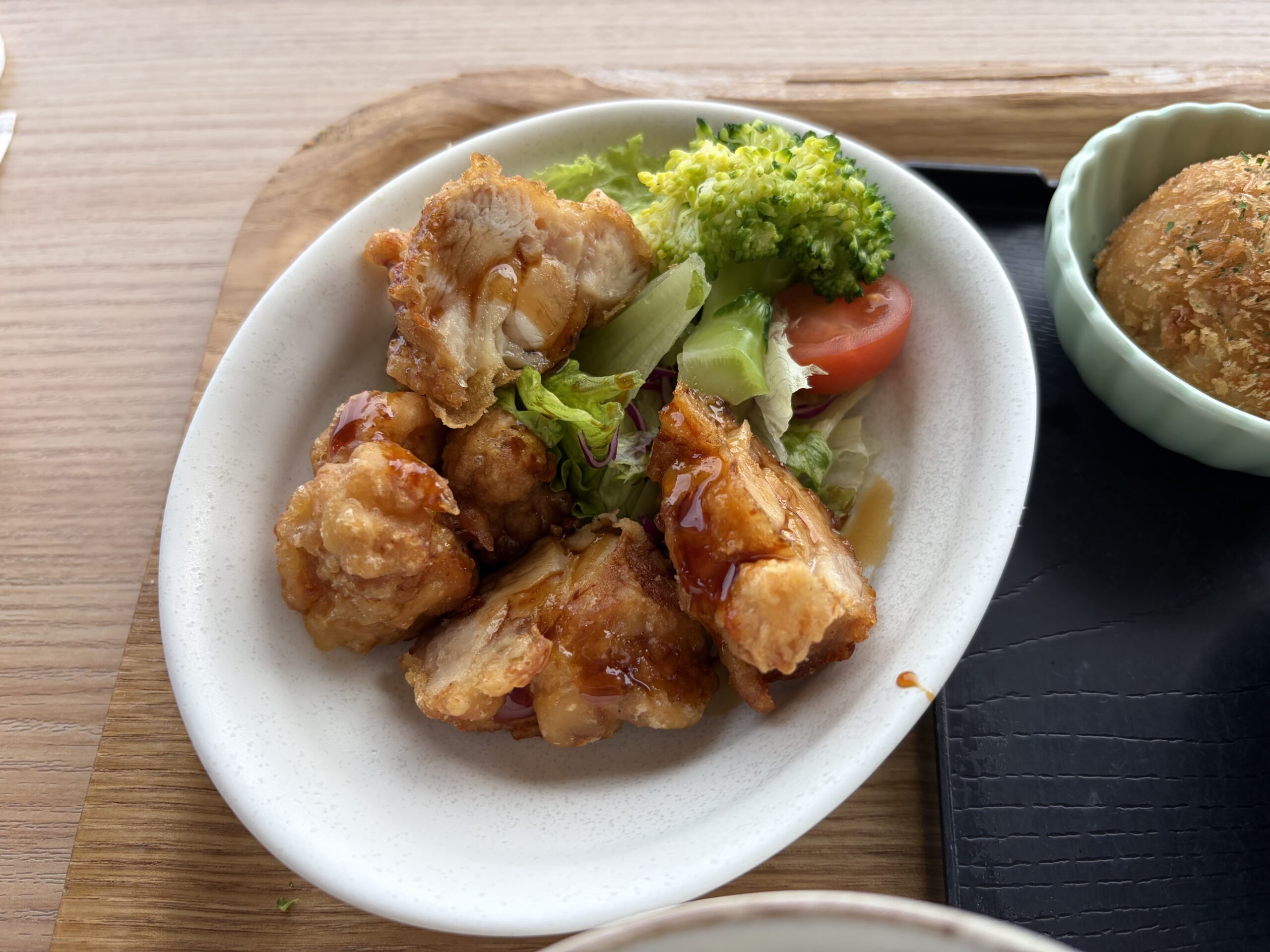 メインは鶏の唐揚げでした。ピリ辛のソースが味を引き締めていて美味しくいただけました。