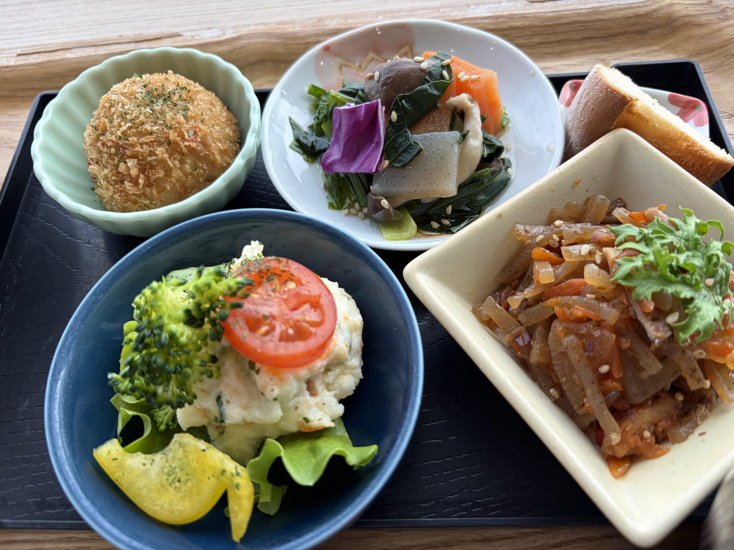 左上から時計回りに里芋コロッケ、野菜と蒟蒻の和え物、デザートのカップケーキ、蒟蒻と野菜のピリ辛炒め、ポテトサラダです。