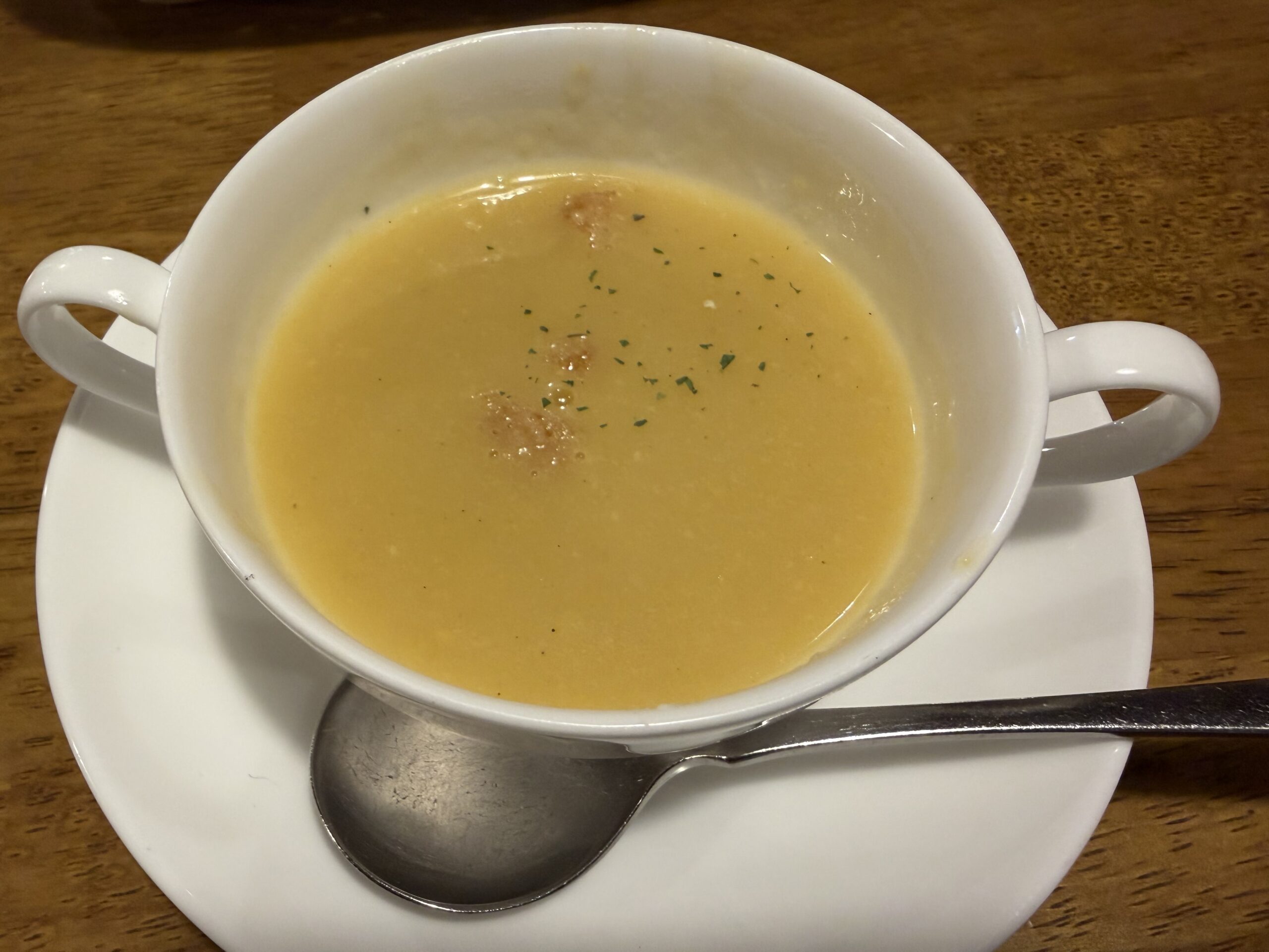 最初にカップスープが運ばれてきます。暖かくて優しいスープが体に染み渡ります。