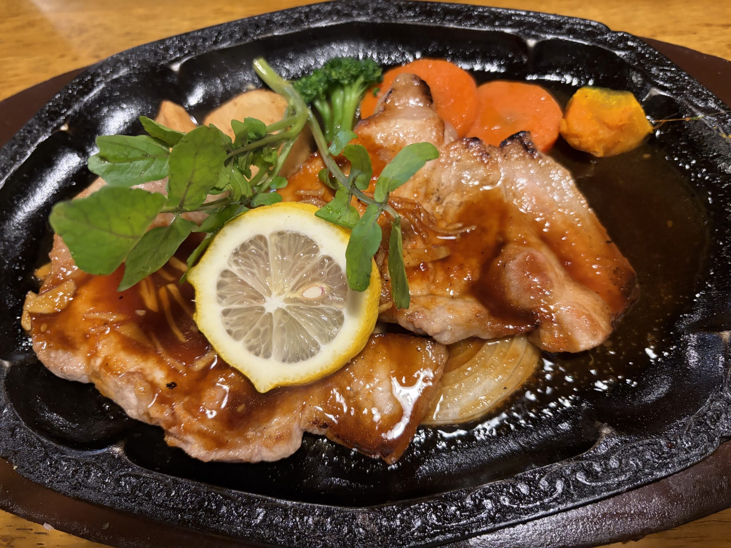 メインが運ばれてきました。生姜の香りが漂ってきます。さっぱりとしたソースにみじん切りの生姜の辛さが相まって食欲をそそります。付け合わせの野菜も美味しくいただきました。