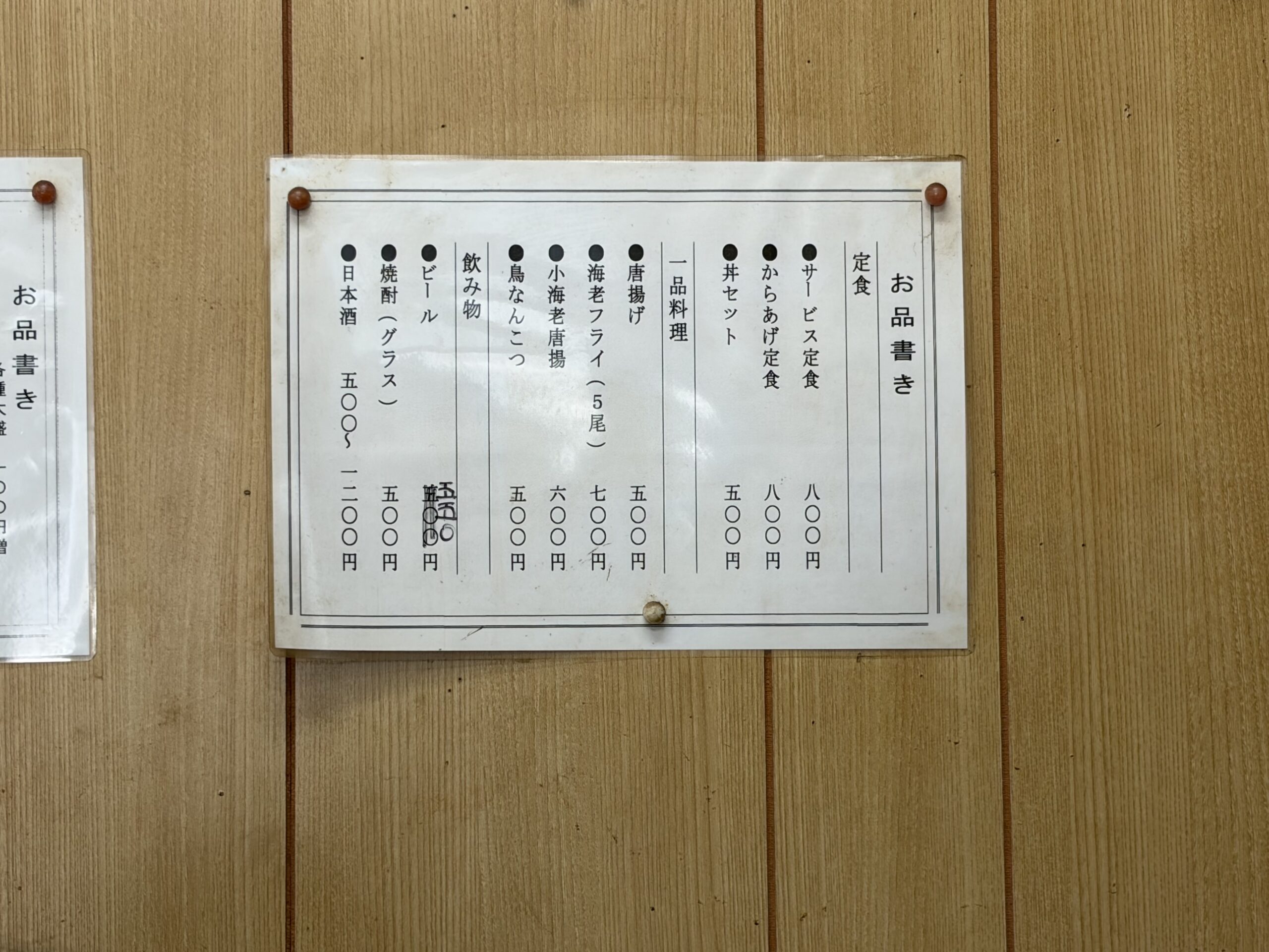 定食は「サービス定食」と「からあげ定食」と「丼セット」の三種類がありましたが、初めてなので家内共々「サービス定食」を注文。