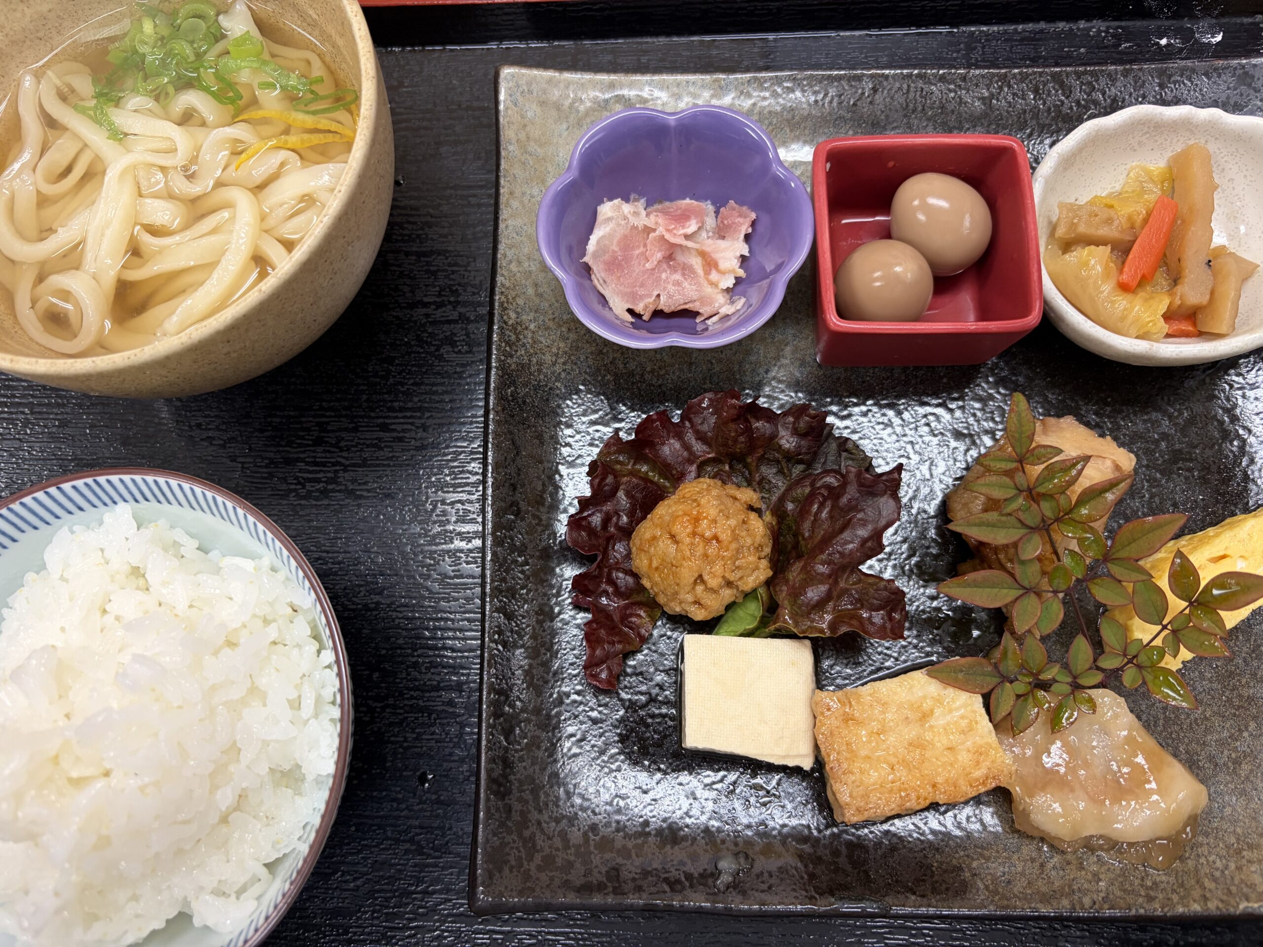 しばらくして料理が運ばれてきました。大きな平皿に盛られた惣菜とミニサイズのかけうどんとご飯です。