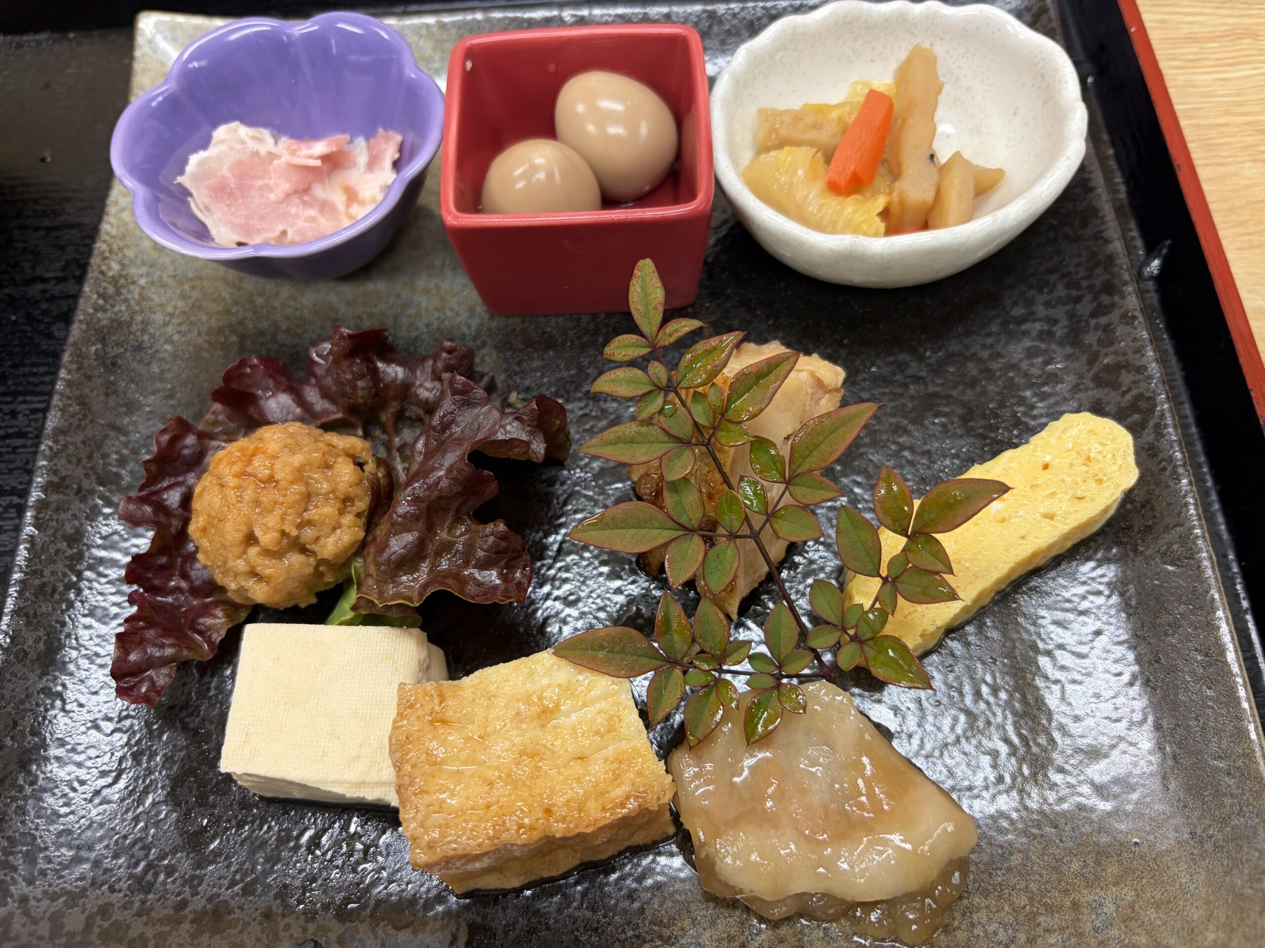 惣菜は九種類あって左上から右に生ハム、ウズラの煮卵、人参と白菜と平天の煮物、真ん中は肉団子、紅葉の葉に隠れていますが鶏の含め煮、厚焼き卵、左下から右に高野豆腐の煮物、厚揚げ、豚肉のゼリー寄せでしょうか。一つ一つは大きく葉ないものの品数が多いので食べた気になりました。ふと気づくと家内の惣菜は微妙に内容が違っていました。