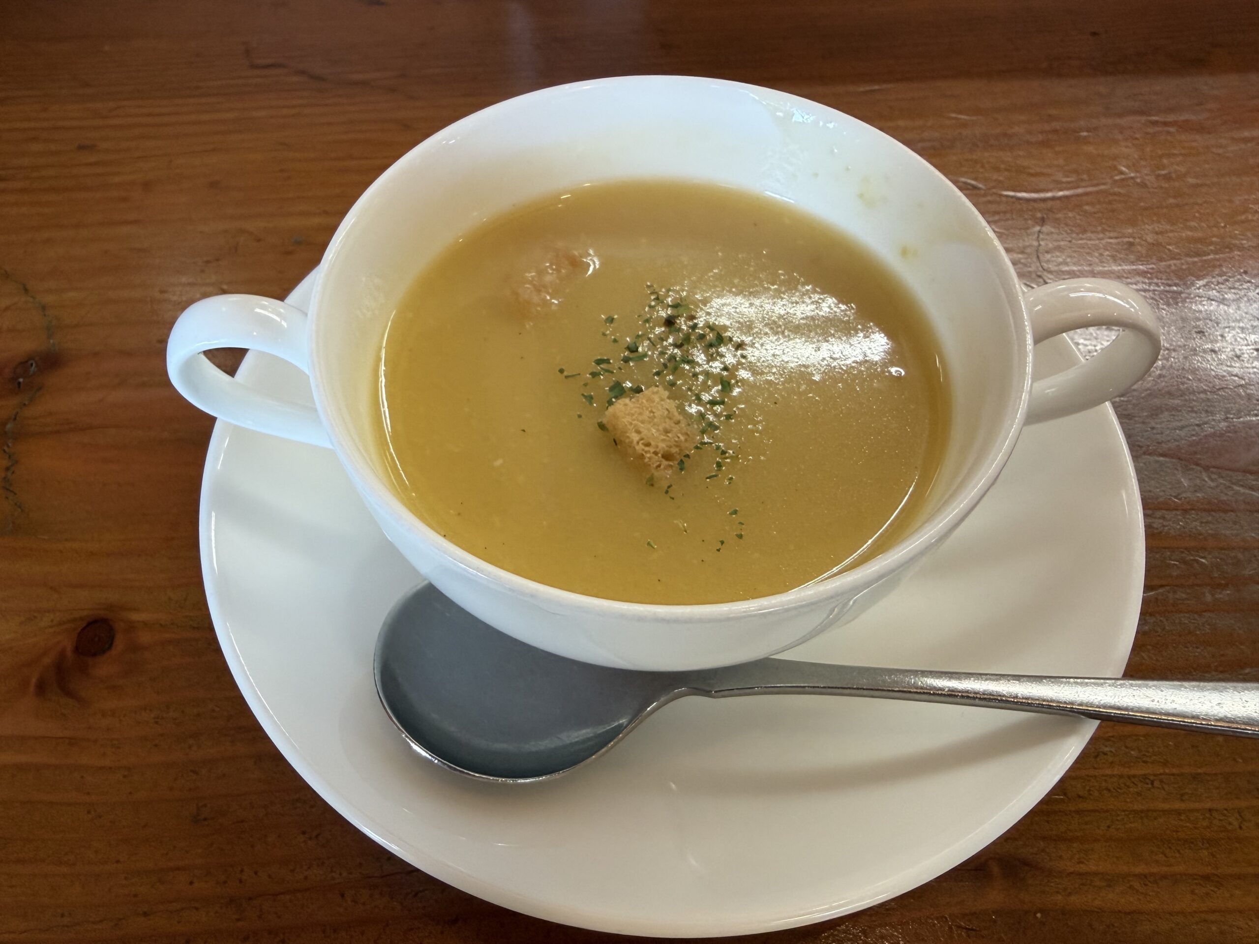 最初にカップスープが運ばれてきます。仄かに甘さが感じられる優しい味と程良い暖かさが体に染み渡るようです。