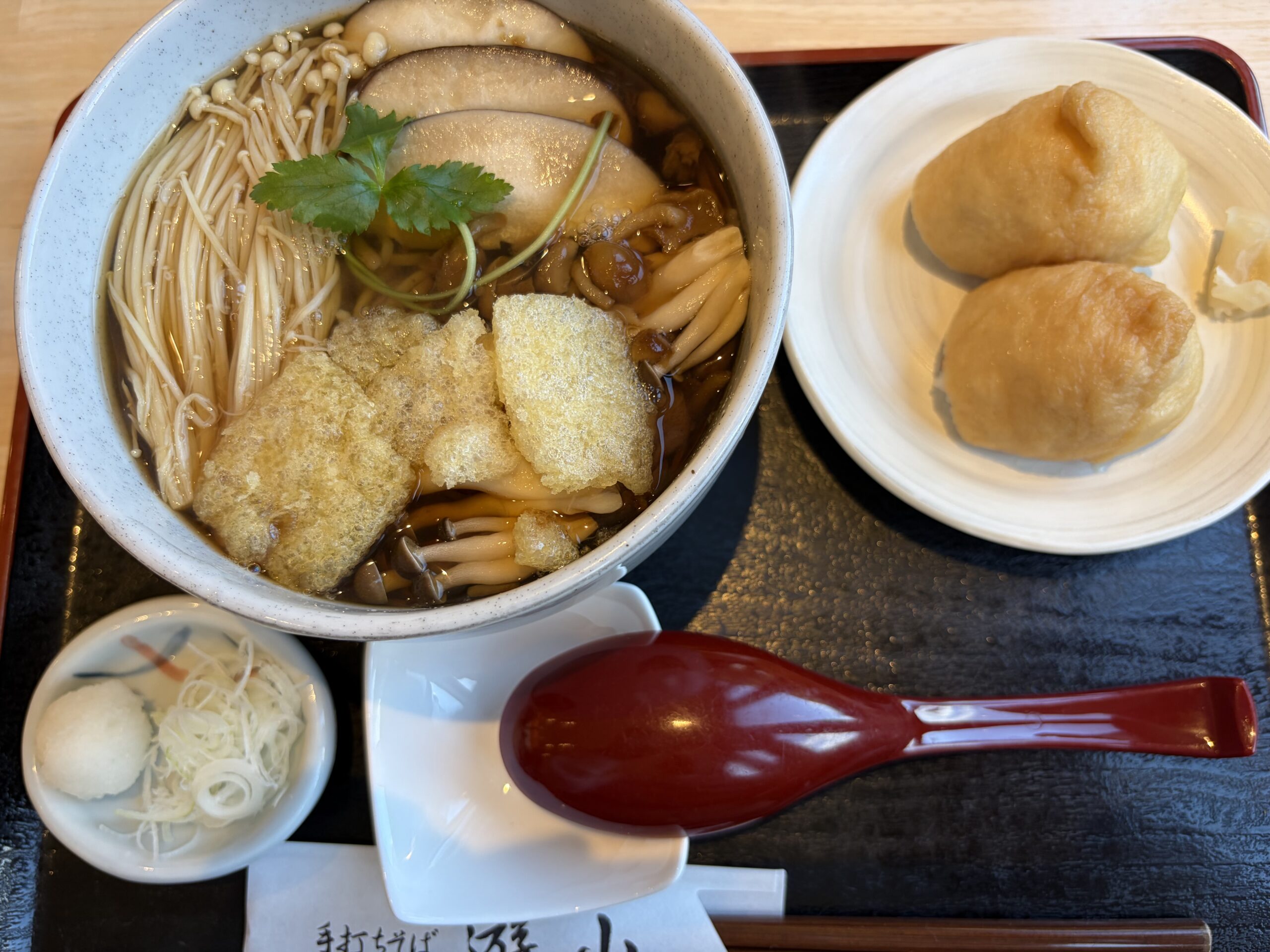 私も家内も「きのこそば」を注文。追加で「いなり寿司」もお願いしました。