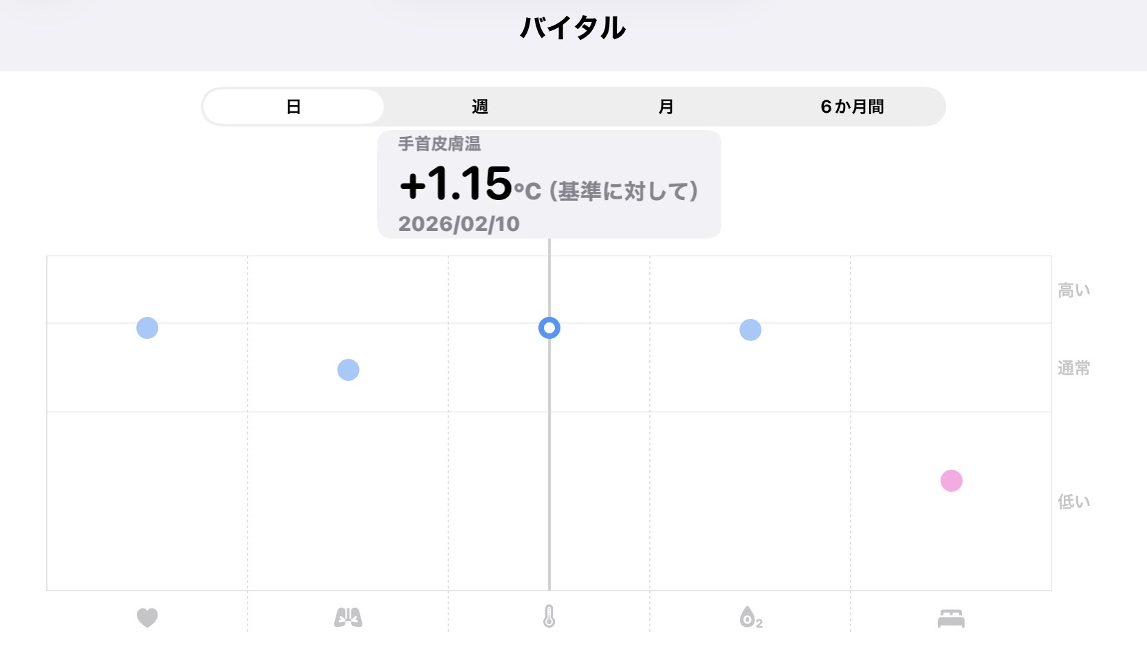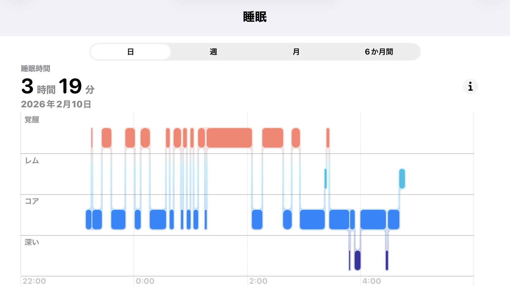 睡眠状況を見ると23時から翌3時頃までウトウトしていたようです。明け方に少し眠れましたが十分ではありませんでした。