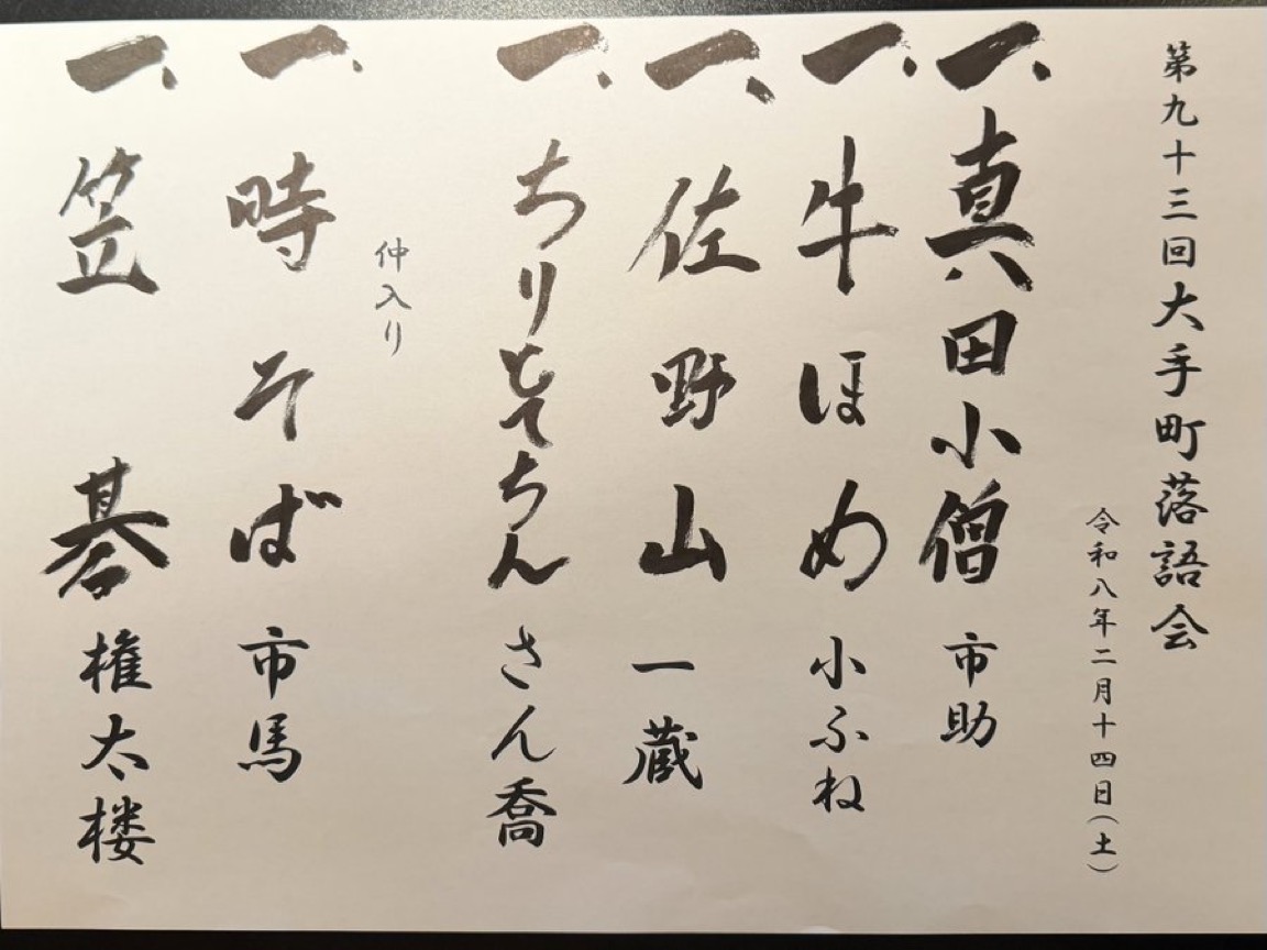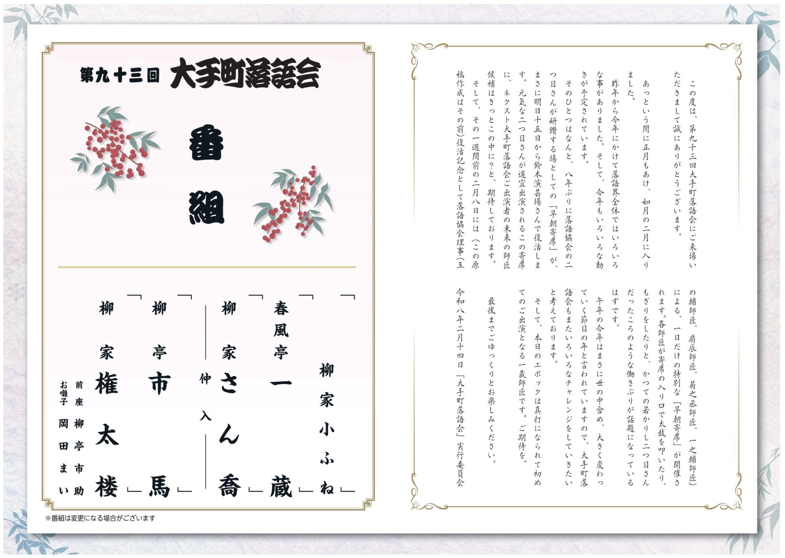 今日の配信は2月14日(土)に日経ホールで開催された『第九十三回大手町落語会』です。こちらは会場で配布されたパンフレット。