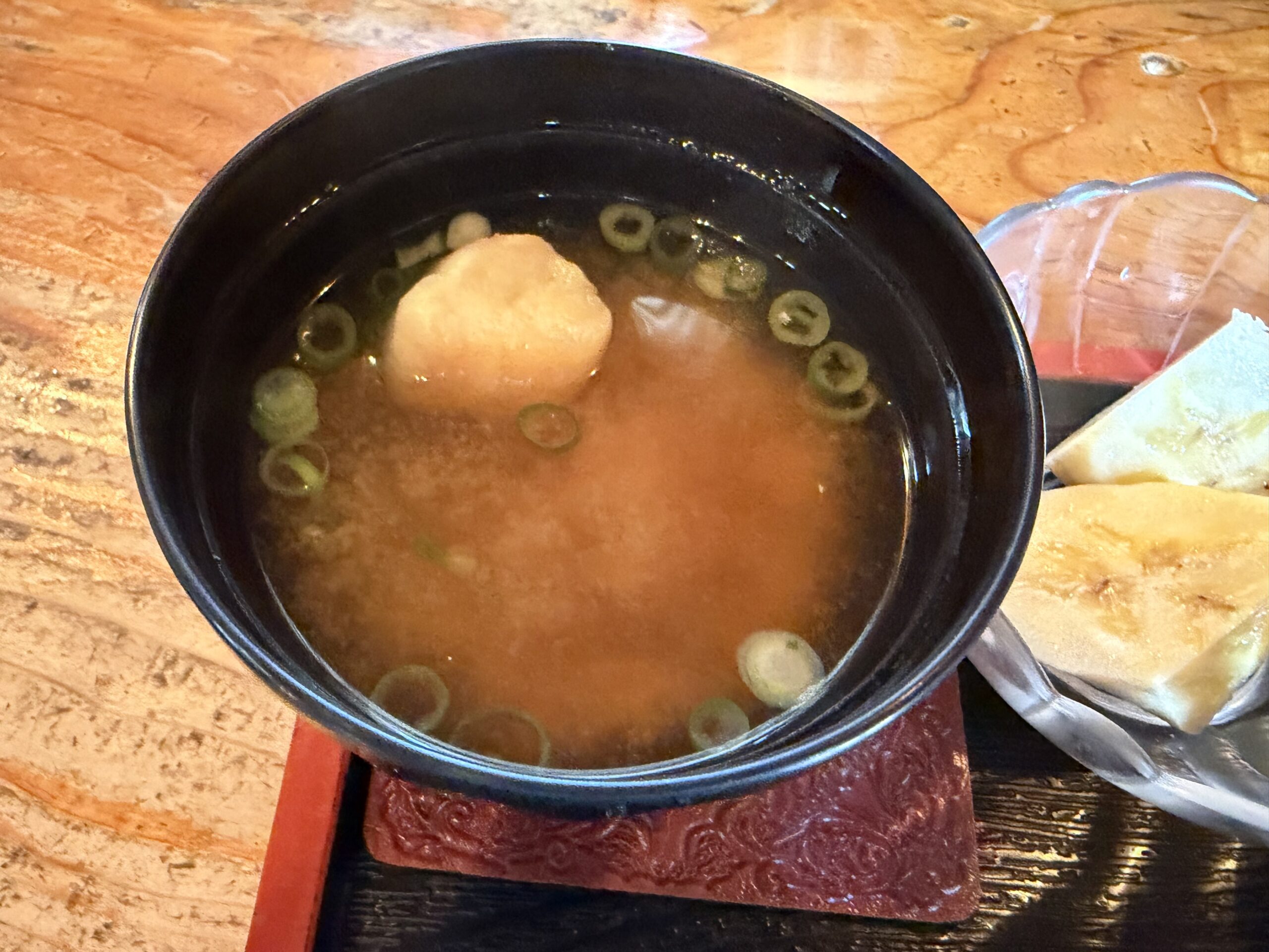 味噌汁はいつもの麩の味噌汁。右側にはデザートのバナナがあります。