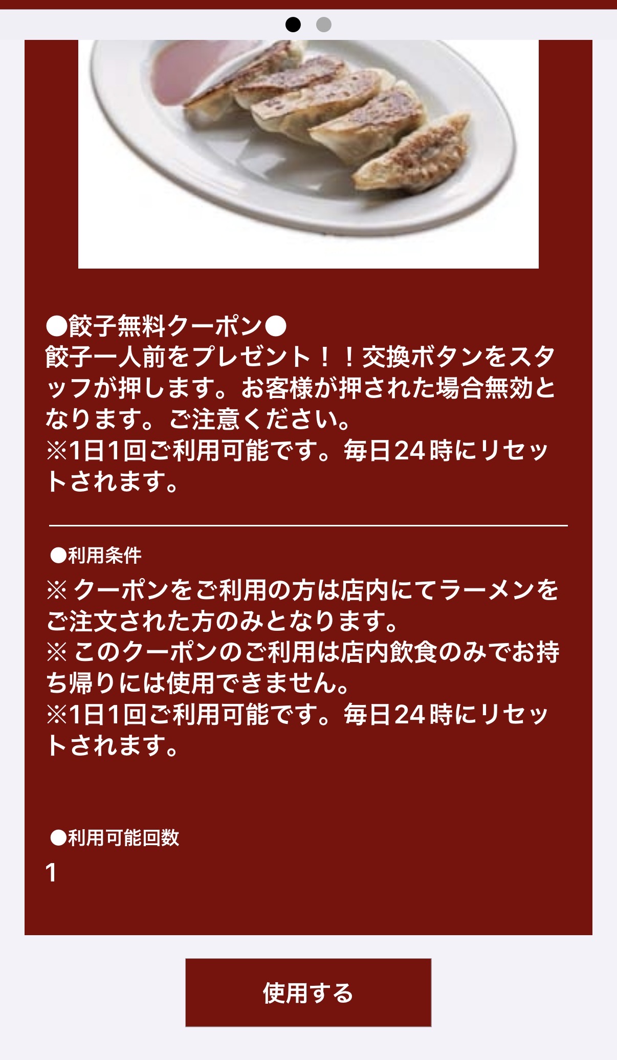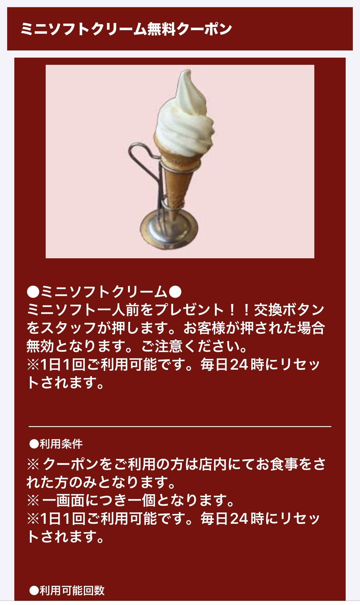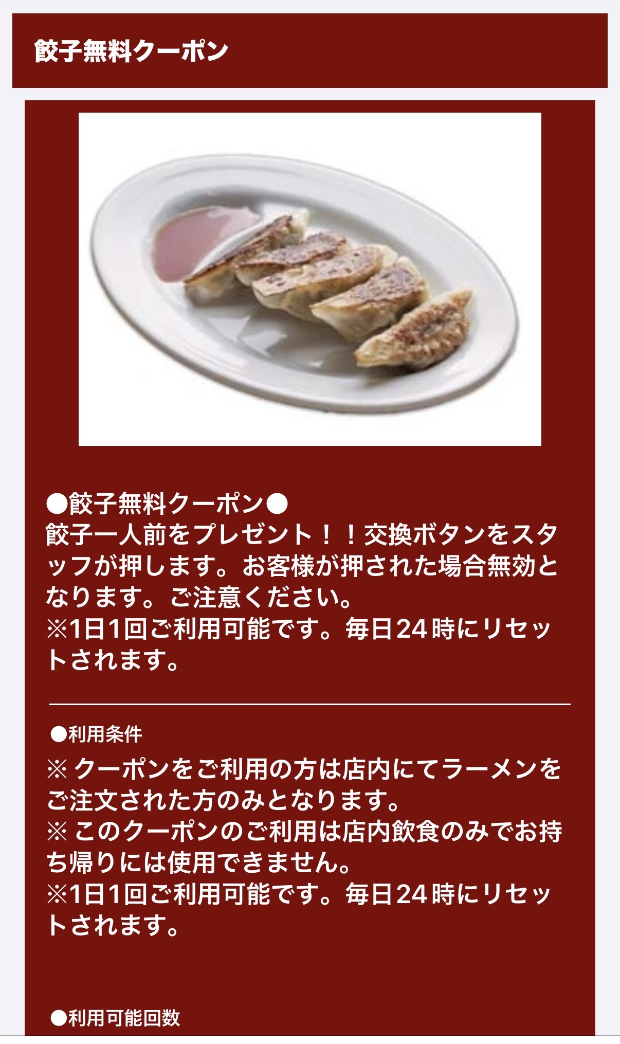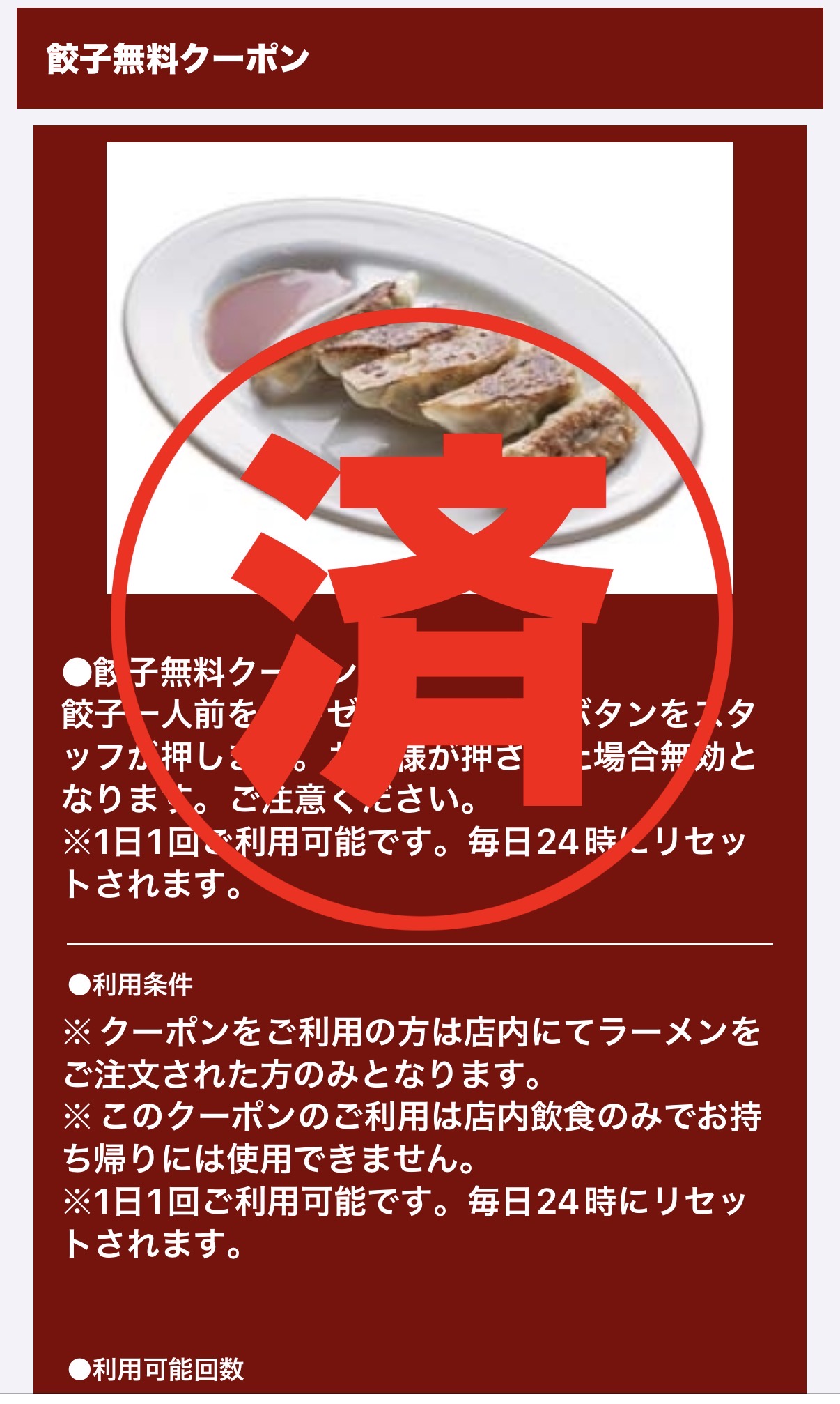 クーポンをクリックすると餃子の無料クーポンが表示されました。説明には「店内にてラーメンをご注文された方のみ」が利用可能で「1日1回ご利用可能」とあります。「毎日24時にリセットされ」るようなので毎回、餃子がタダになるようです。家に帰ってから気が付いたのですが、クーポンには「ミニソフトクリーム無料クーポン」もありました。こちらも餃子同様、日が変われば何度でも使えるようです。