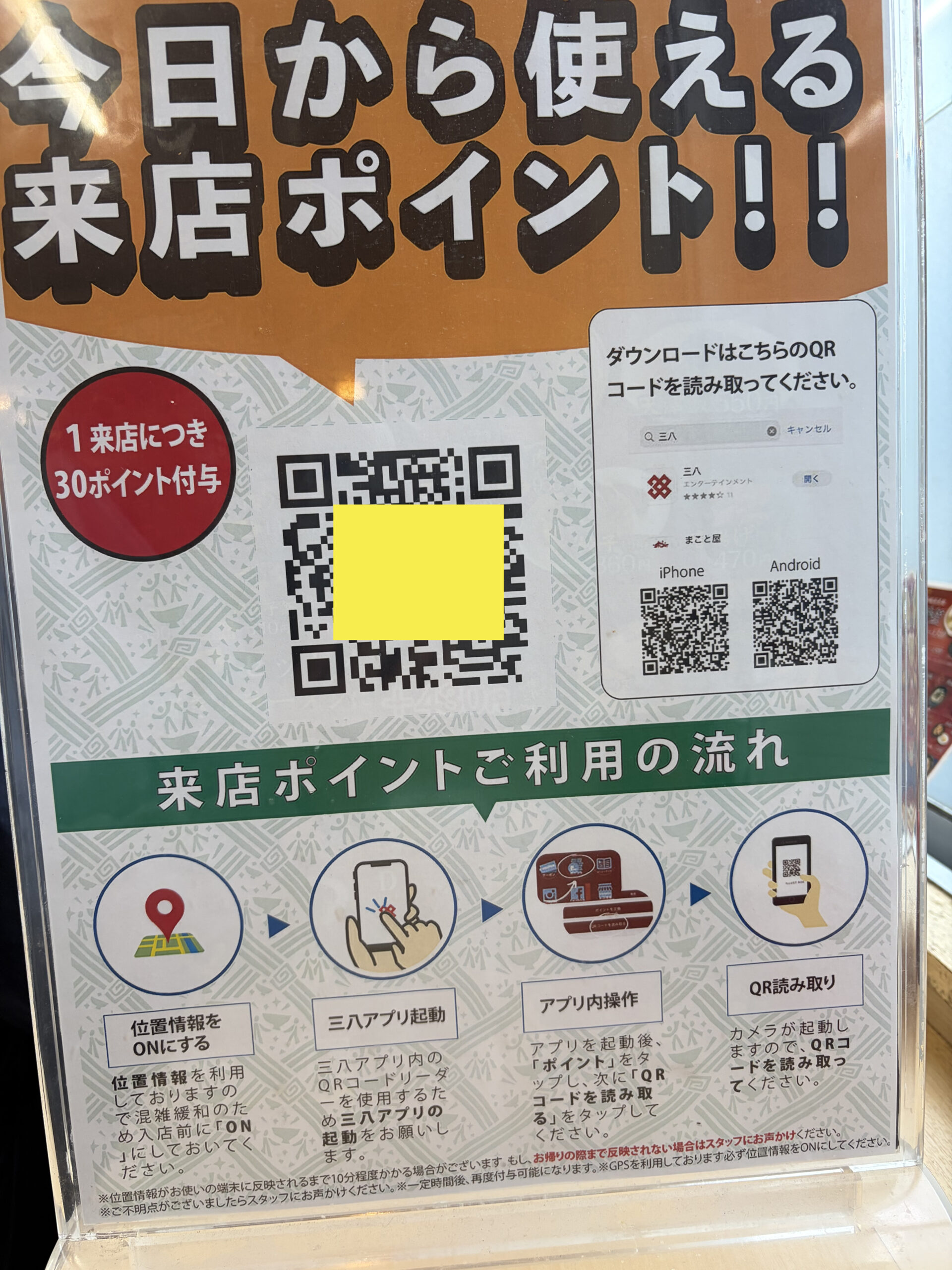 ポイントには「来店ポイント」なるものもあり、アプリを起動すると1日1ポイント、1回の入店で30ポイントが付くようです。入店時のポイントは席に置いてある説明書きのQRコードを読み取って受け取るようになります。