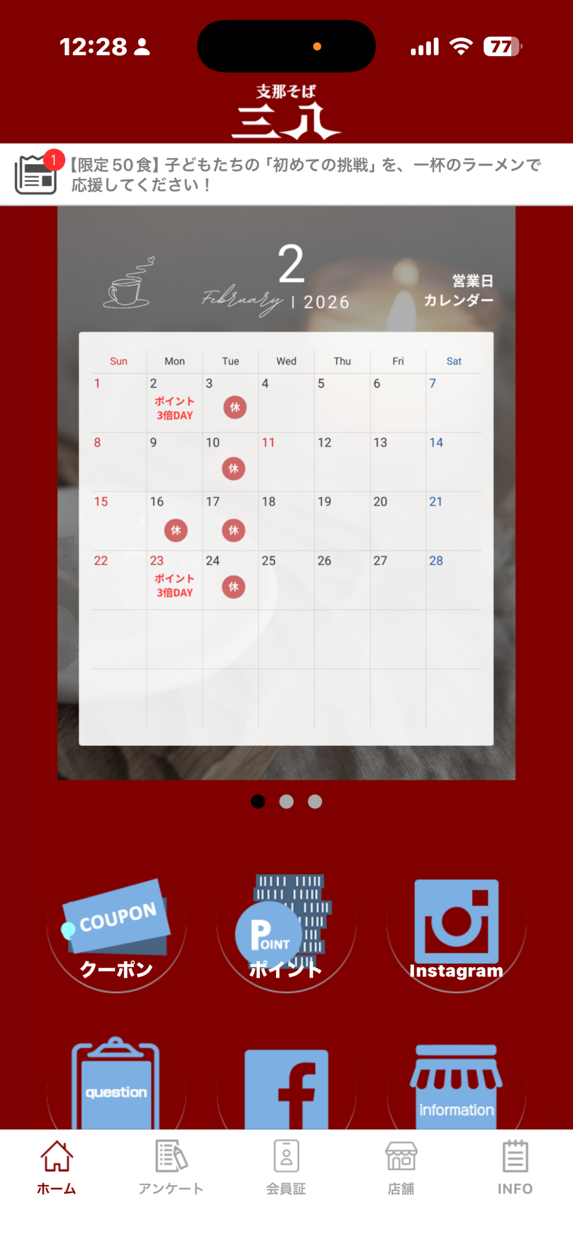 起動してみると営業日カレンダーなどが表示され、クーポンなども使えるようになっていました。