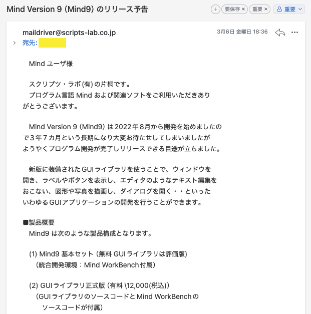 その後、部屋の片付けをしているとMind関係のFDや書籍、ソースコードなどが出てきましたが、DOS環境も無くなっていたので全て廃棄しました。しばらくしてMindがバージョンアップするというニュースを見つけてメーリングリストに登録していたところ、先日(3月6日)Mind9のリリース予告というメールが飛び込んできました。