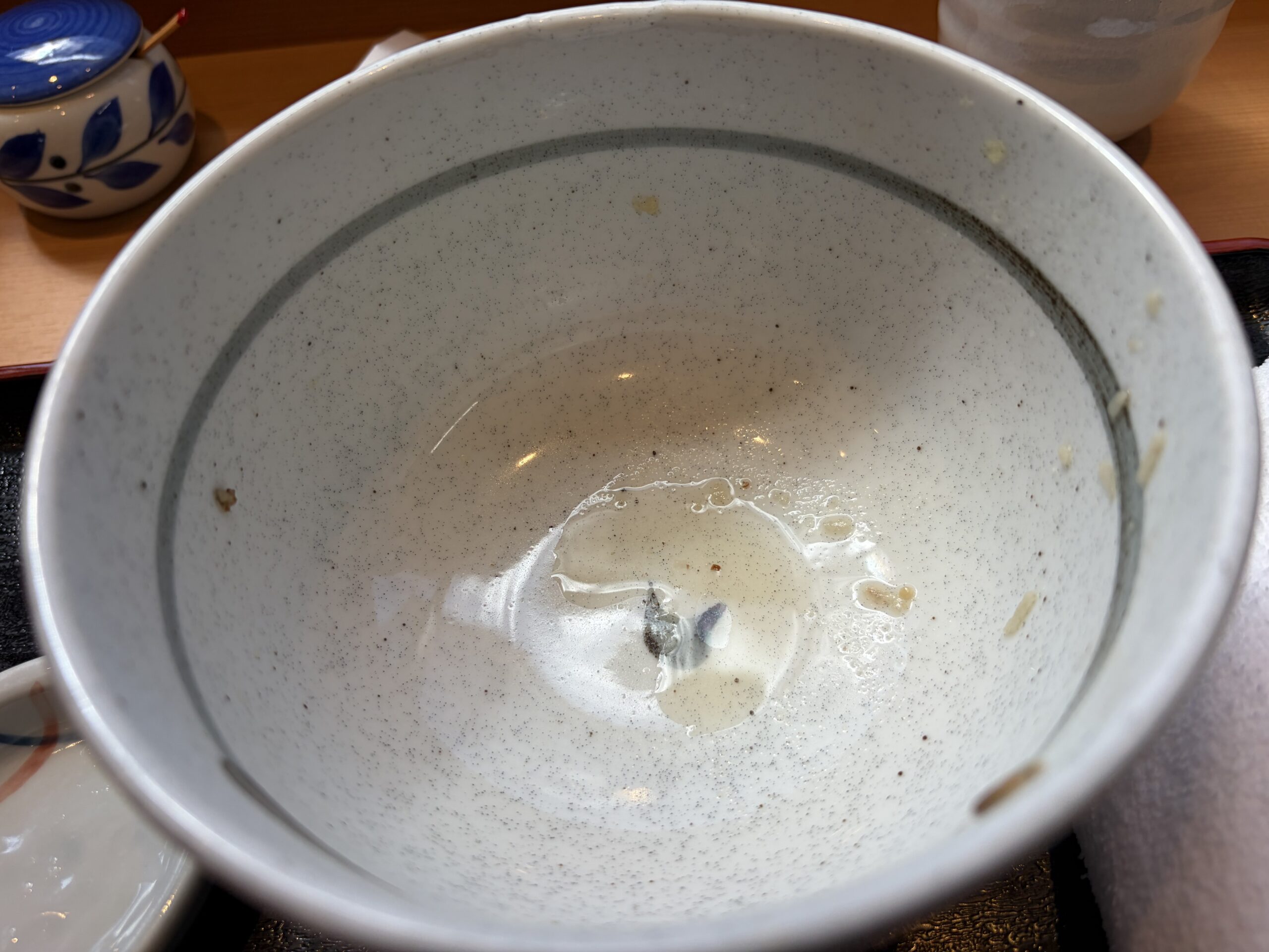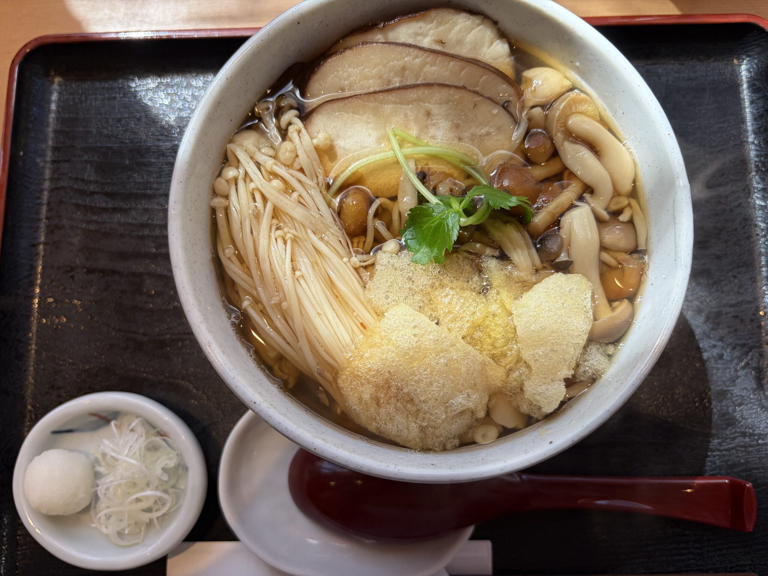 丼から天恵菇(肉厚の椎茸)の良い香りが漂ってきます。天恵菇、シメジ、エノキ、ナメコときのこ尽くしの一杯です。天恵菇はしっかりした歯応えがあって香り高く、とても美味しくいただけます。