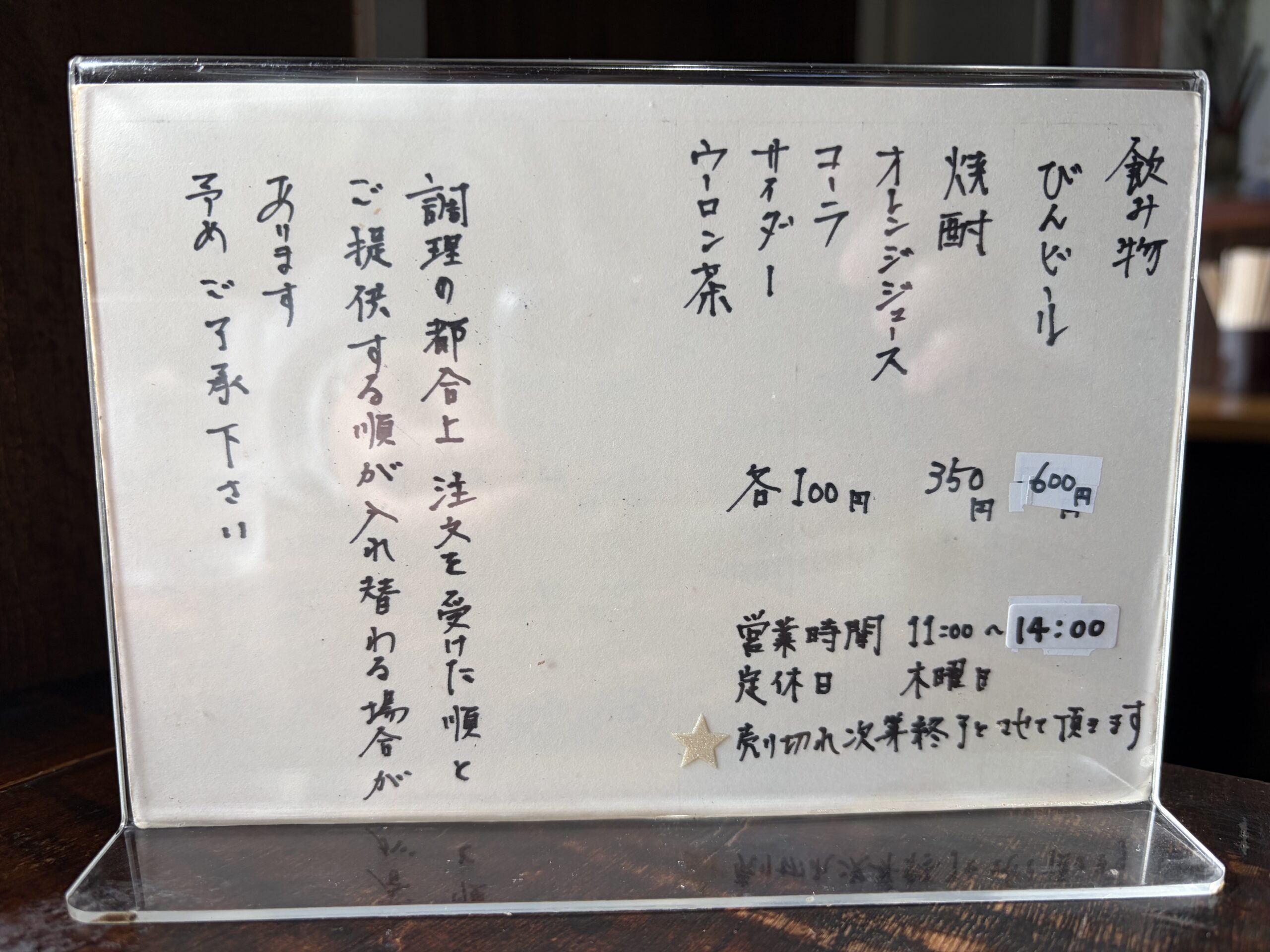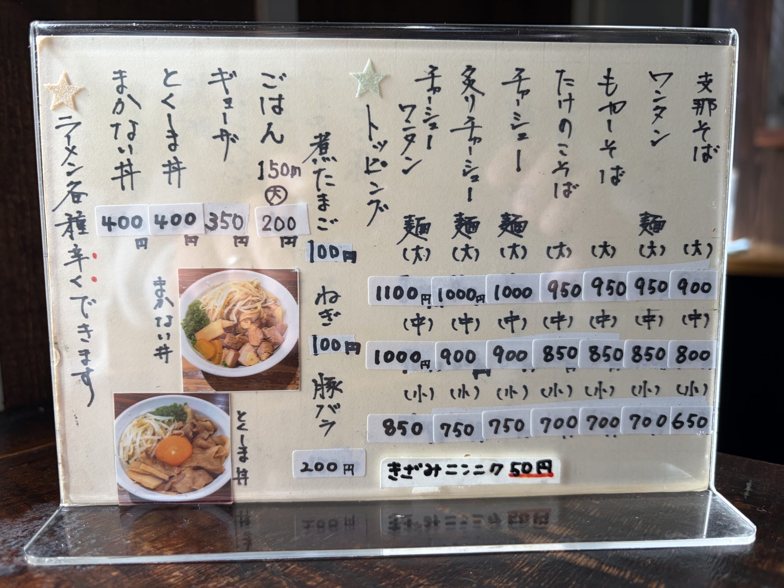 メニューはこちら。若い方の要望があるのか「ラーメン各種辛くできます」と書かれています。