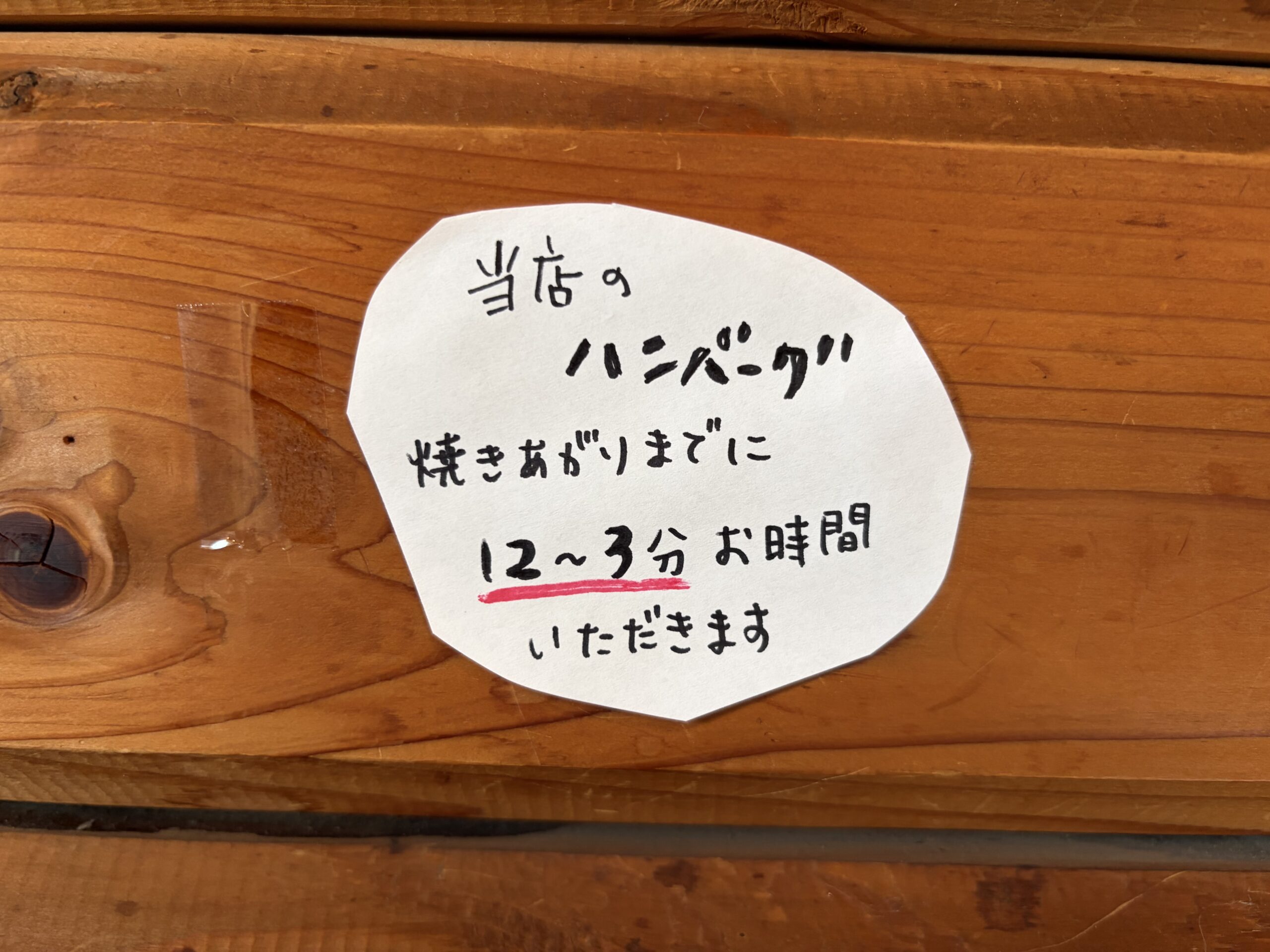 席の横にはハンバーグは調理に少し時間がかかるとの張り紙がありました。