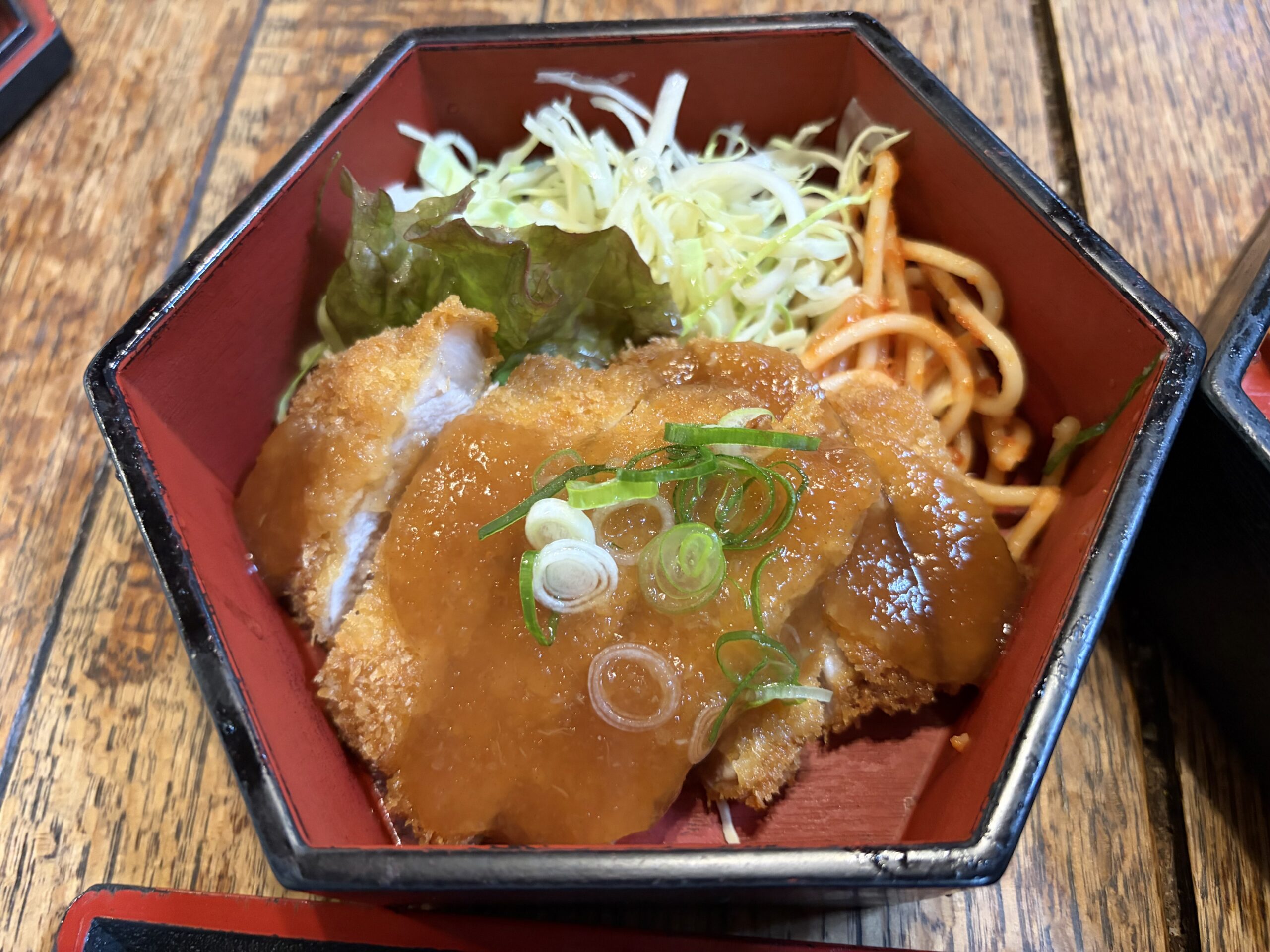 メインの「国産豚のロースカツみぞれソース」です。付け合わせはキャベツとレタスとスパゲッティ。ロースカツは思ったよりボリュームがあり、みぞれソースのお陰か脂っぽさはあまり感じませんでした。