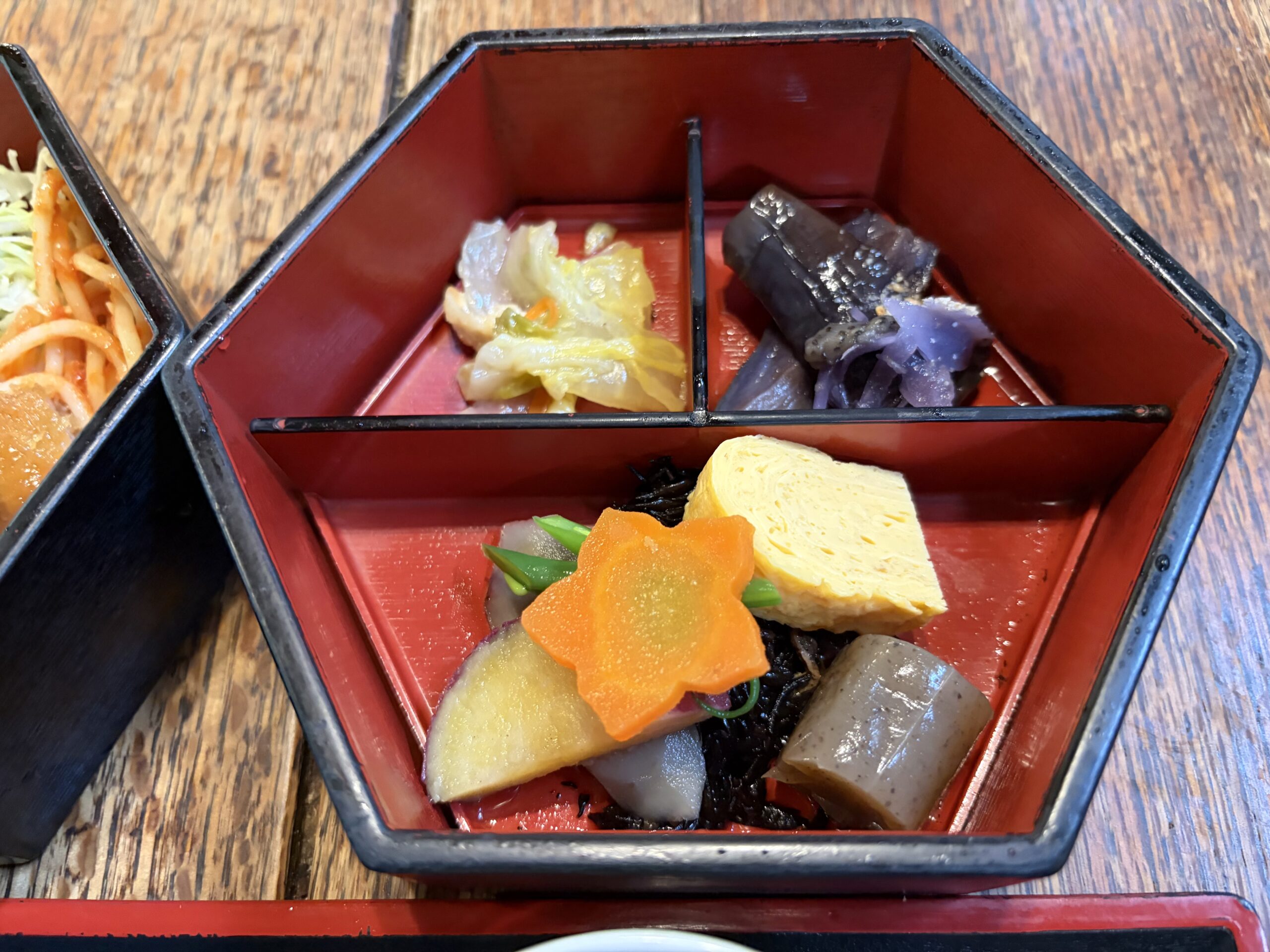 こちら左上は白菜と油揚げ、右上は茄子の煮浸し、下は野菜の炊き合わせです。適度な量で箸休めに丁度良い感じです。