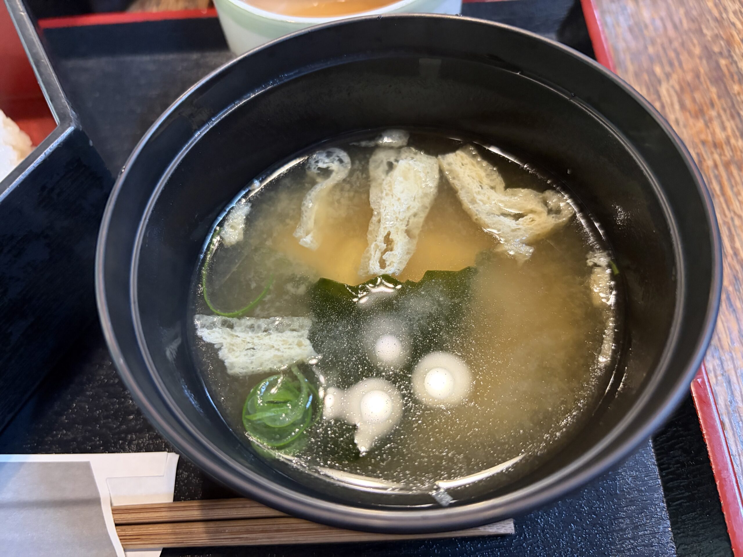 ワカメと豆腐と油揚げの味噌汁です。出汁は美味しいのですが何を使っているのか判りませんでした。