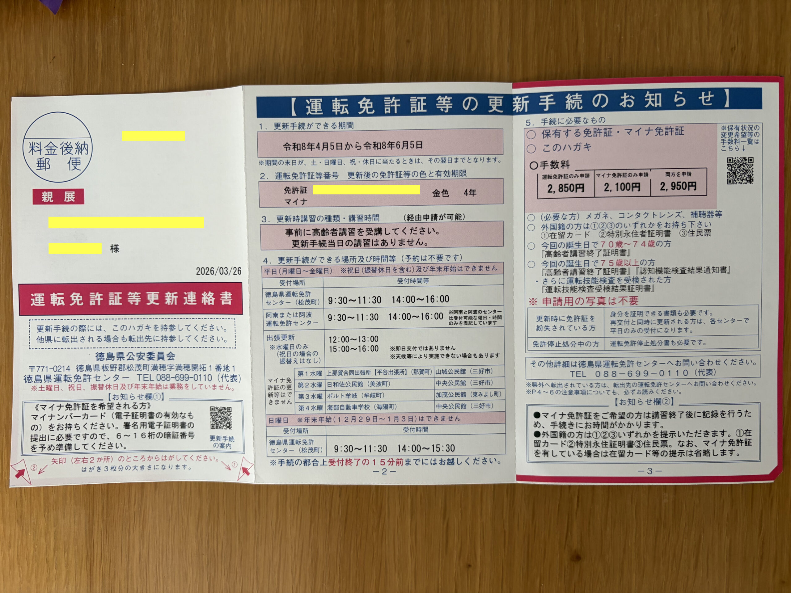 運転免許証の更新時期が近づいてきた3月27日に「運転免許証等更新連絡書」が送られてきました。