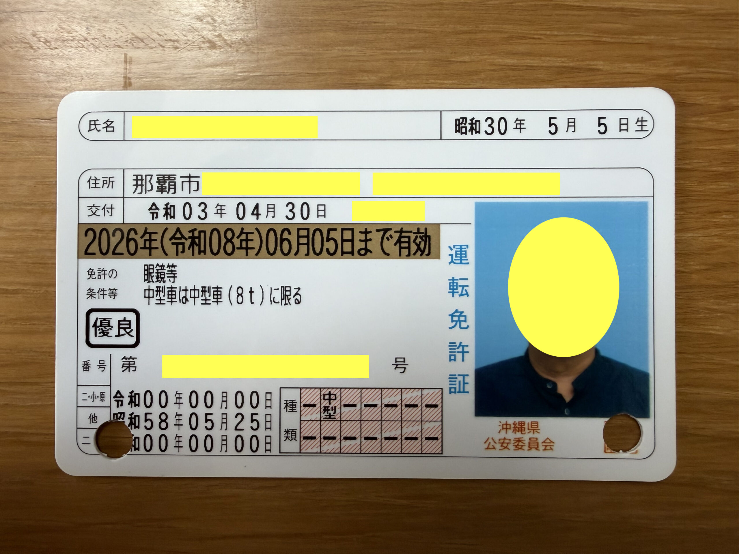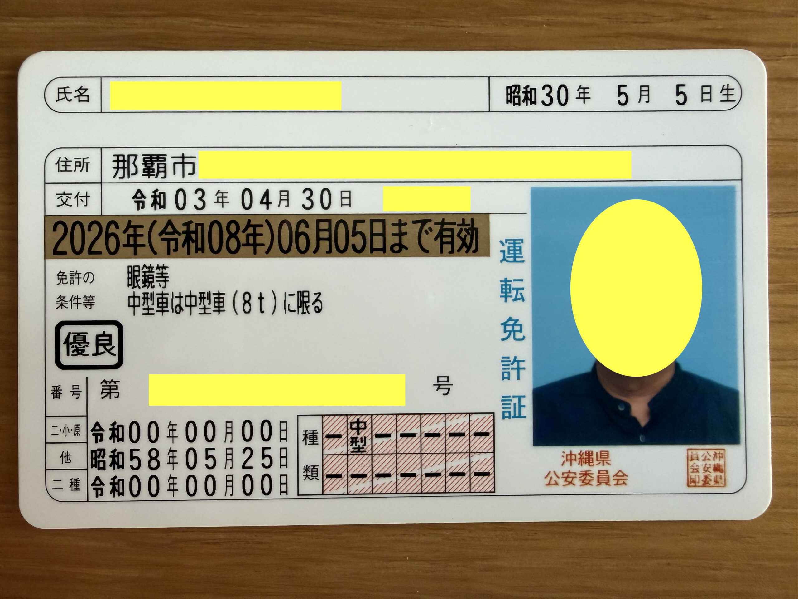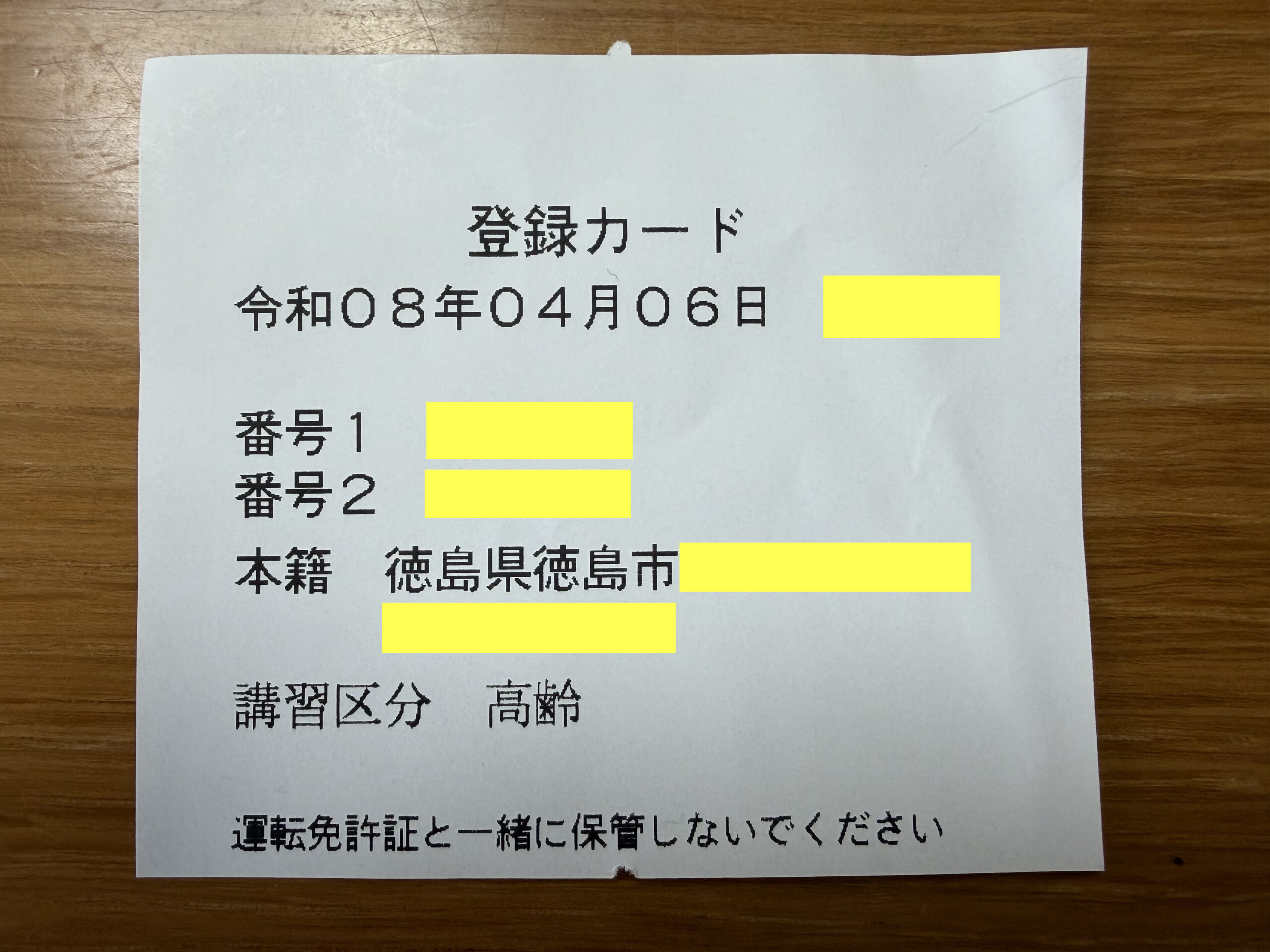 設定した暗証番号のメモをいただきました。本籍も書かれていて講習区分は「高齢」になっています。古い免許証を記念に持って帰っても良いと言われたのでいただきました。沖縄で生活していた名残りです。