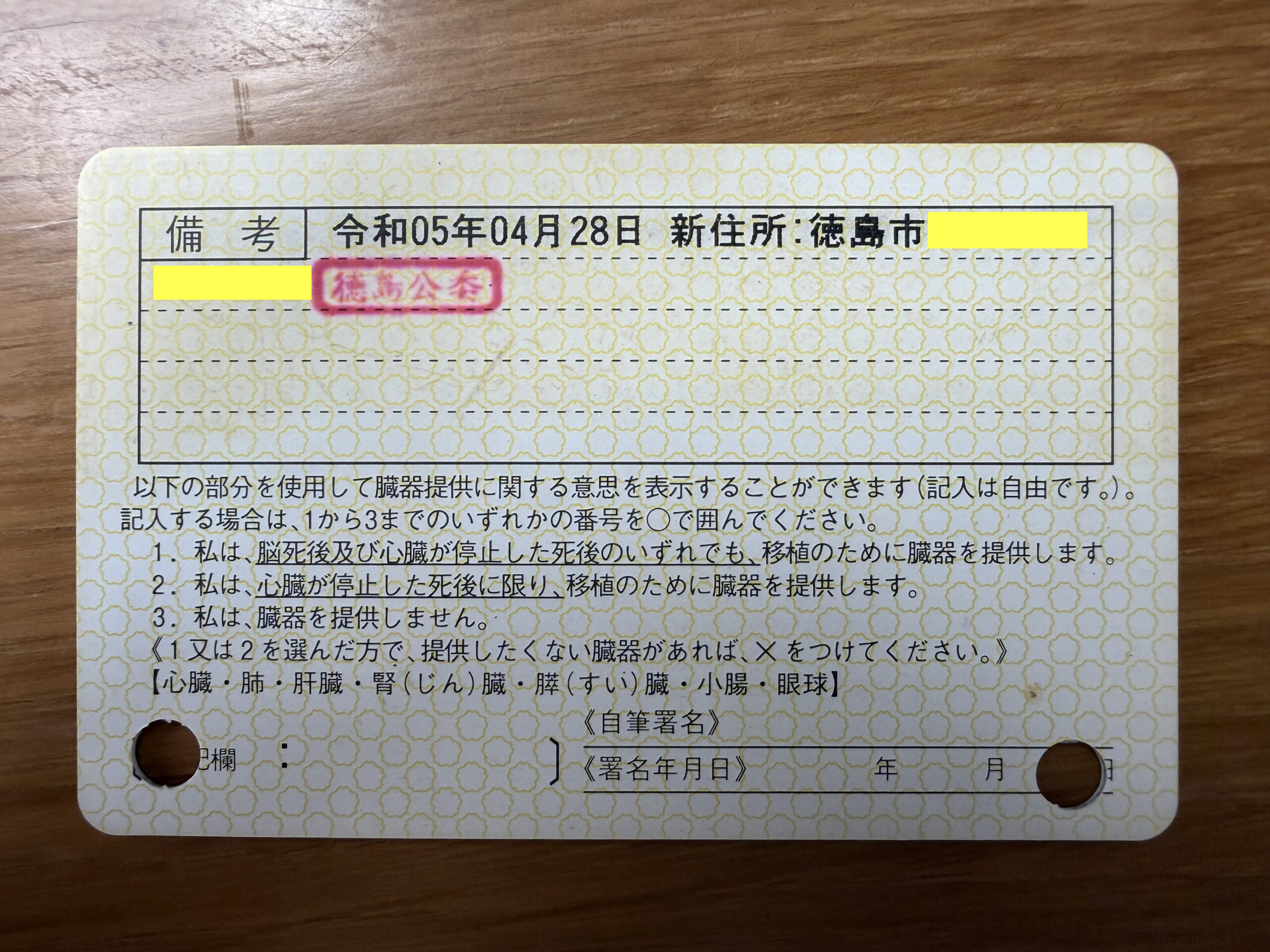 裏書に沖縄から徳島に戻った時の住所変更が記載されていて良い記念になります。