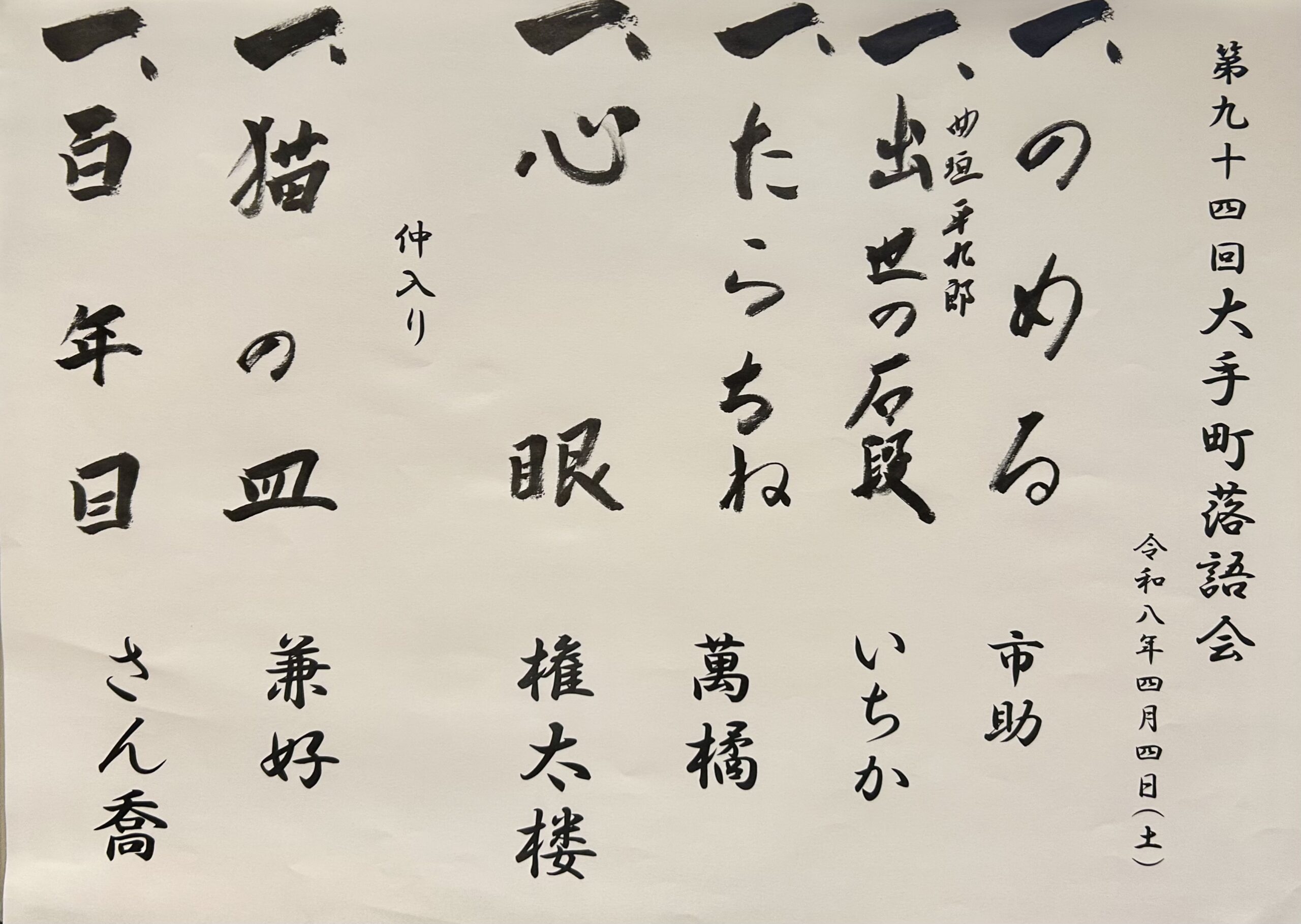 今日の配信は4月11日にサンケイホールで開催された「第九十四回大手町落語会」です。演目は以下のとおり。