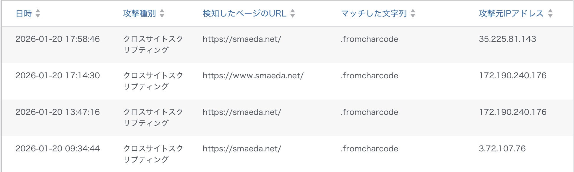 本日(2026年1月20日)4回に渡る(9:34、13:47、17:14、17:58)「クロスサイトスクリプティング」攻撃を受け、WAFがブロックしました。