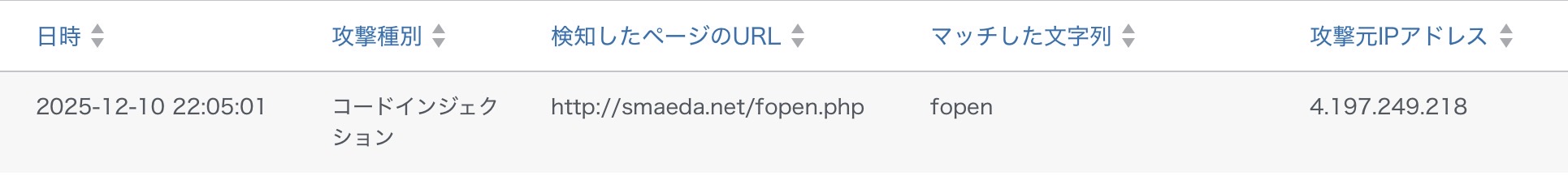 昨夜(2025年12月10日 22:05)、1件の「コードインジェクション」攻撃を受けましたがWAFがブロックしました。