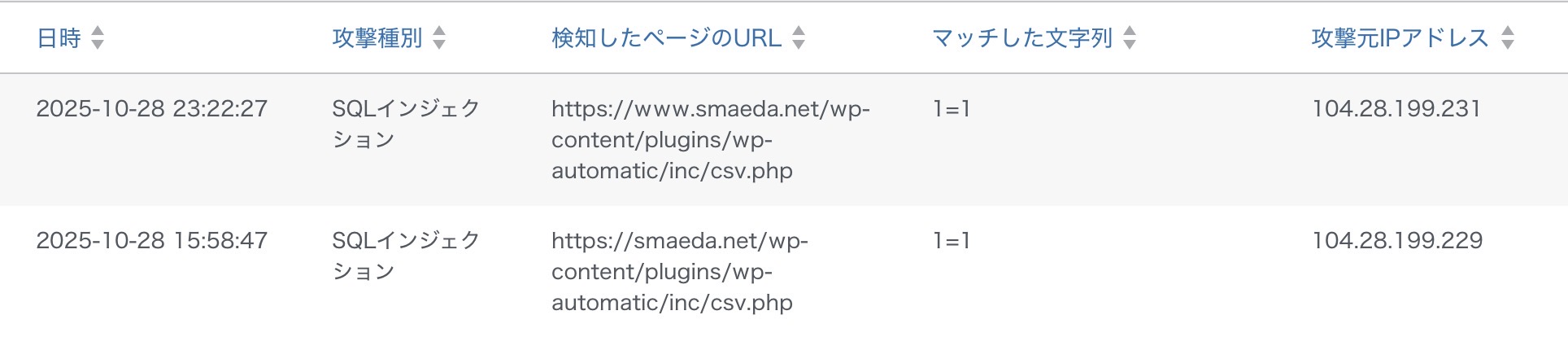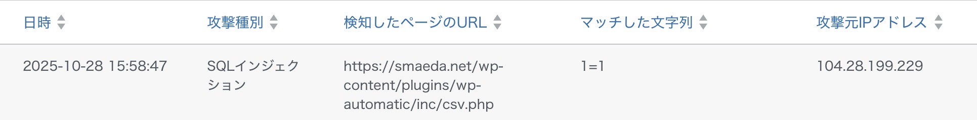 本日15:58にSQLインジェクション攻撃を受け、WAFがブロックしました。