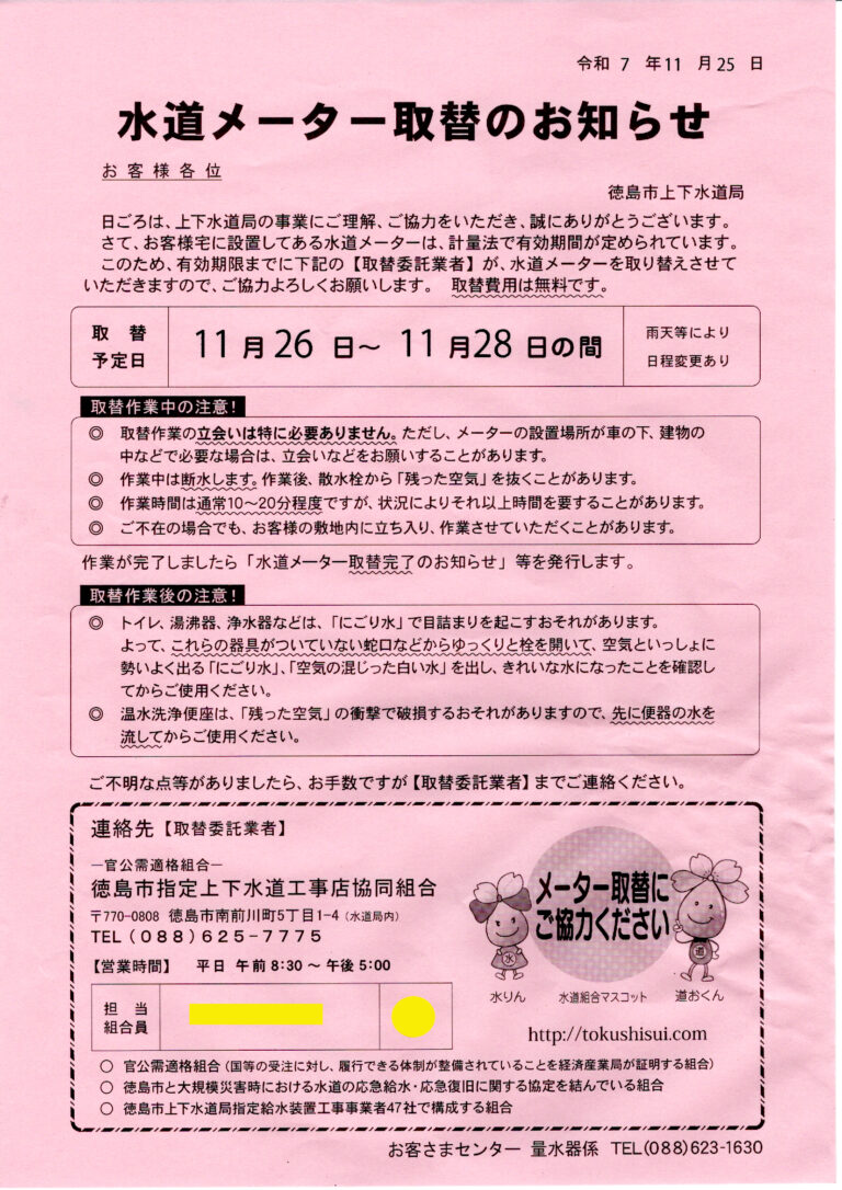 Monologue 2025年11月27日 水道メーターの交換 数日前に水道メーターの取替案内が来ていました。 皆さまのご家庭などに設置されている水道メーターは、計量法によって有効期間(8年)が定められているため定期的に取り替えを行っています。 水道メーターの取り替えは、業者に委託して実施していますので、ご理解、 […]